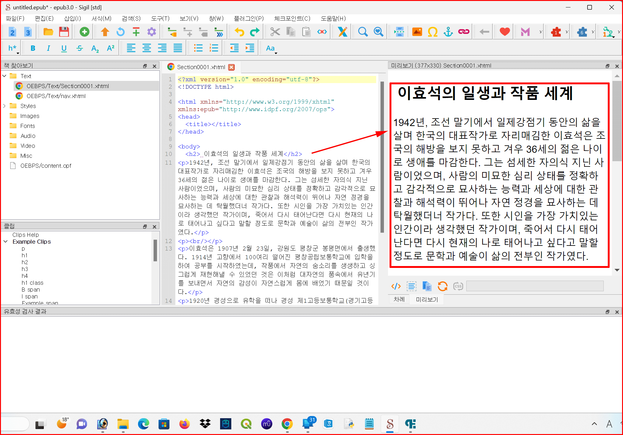 편집기에서 저장한 내용은 Sigil에 반영됩니다. 편집기의 내용대로 보이는 부분이 '미리 보기'입니다. 그러나 내부적으로는 Sigil 창에 있는 HTML문서 편집 형태로 만들어진 것이 외부적으로 깔끔하게 보입니다.