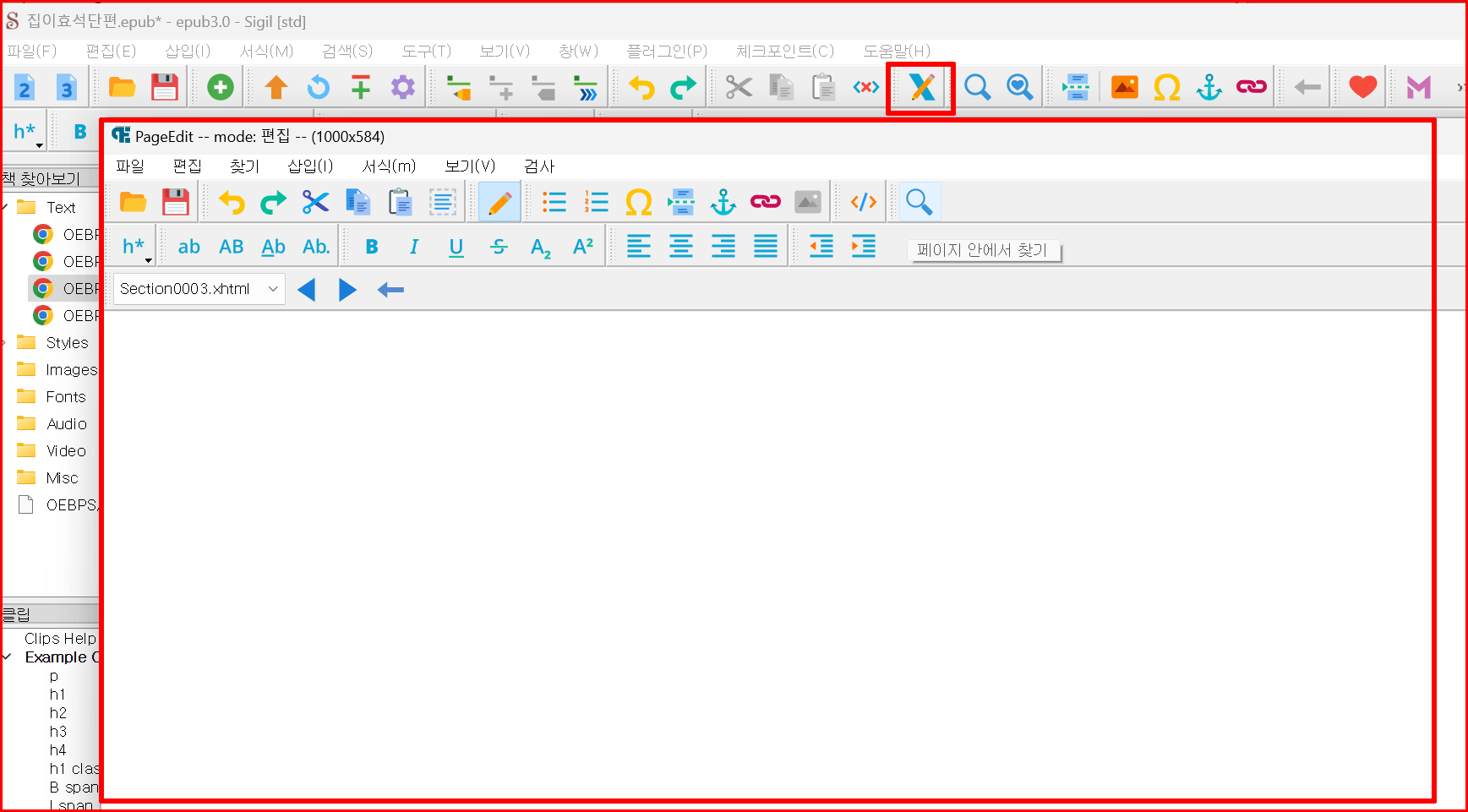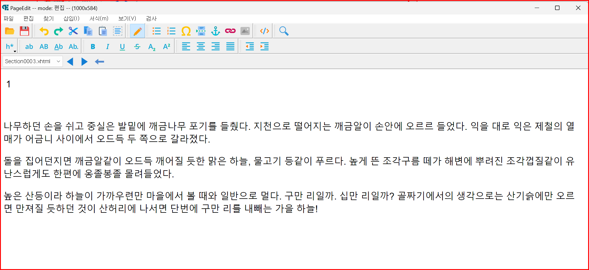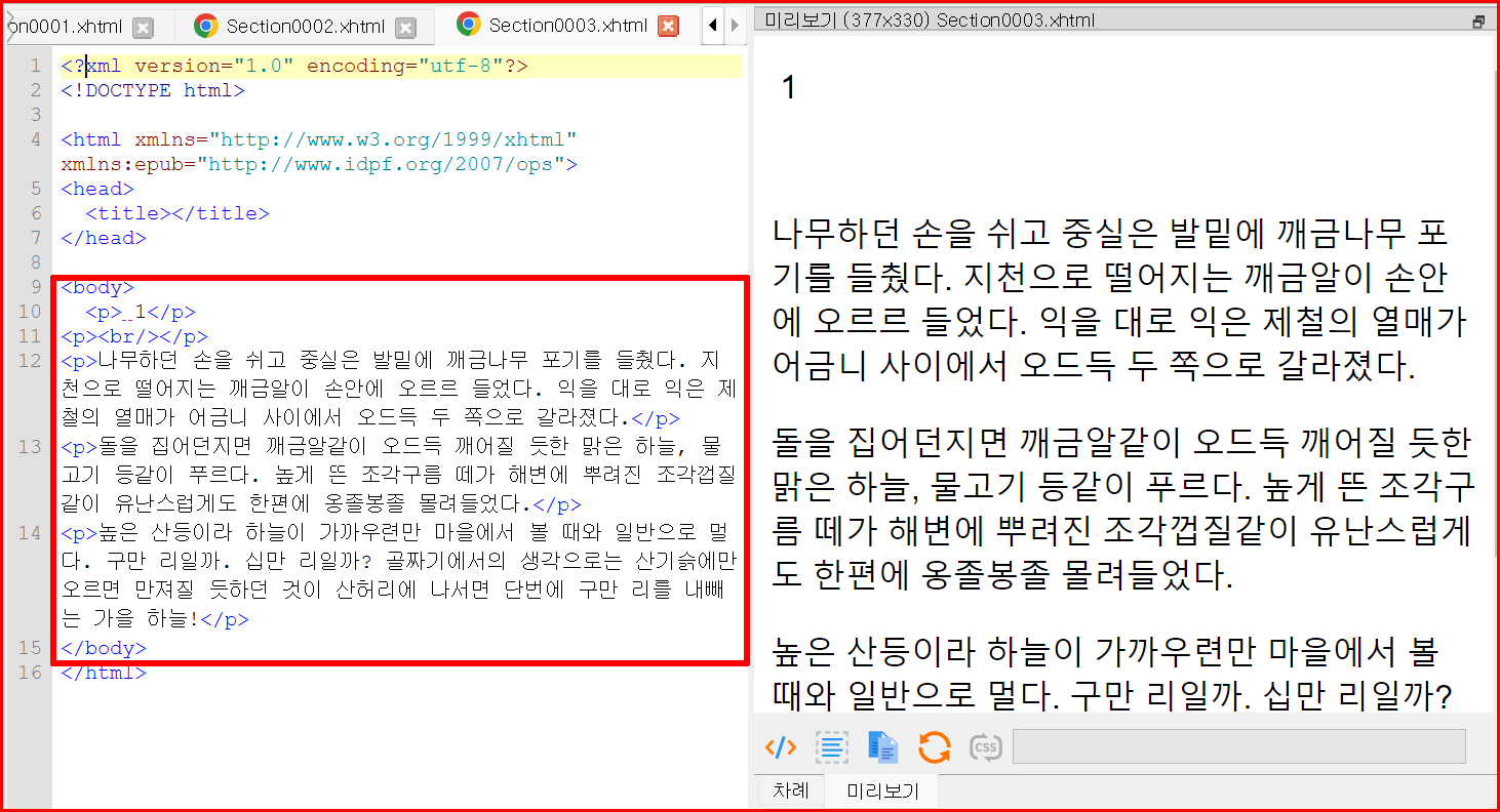 페이지에디트에서 위처럼 작성한 글은 Sigil의 편집창에서는 아래와 같이 나타납니다.