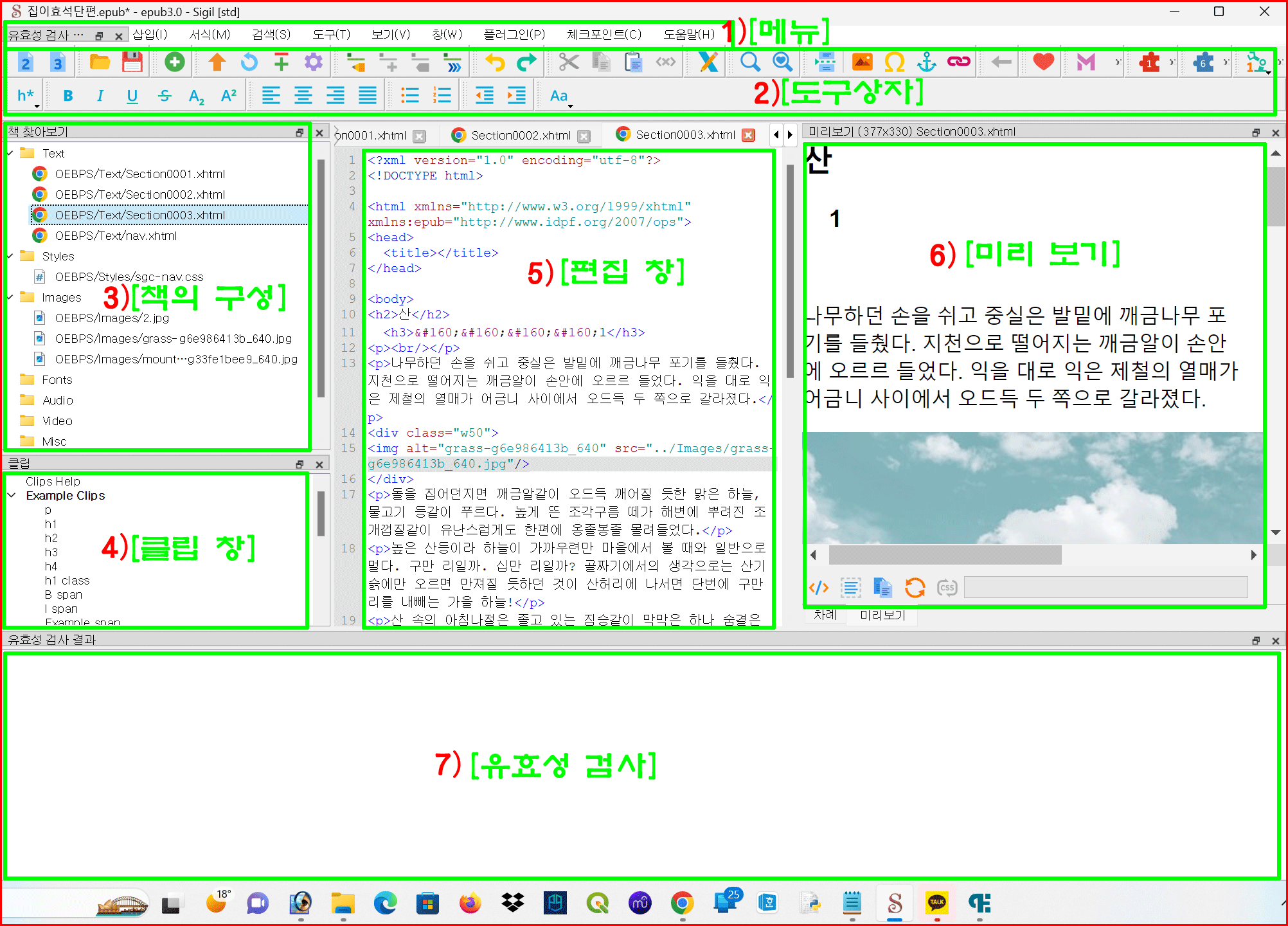 Sigil에서 가장 중요한 창은 '책 구성'과 '편집창', 그리고 '미리보기 창'입니다. 이 세 부분의 관련성을 잘 파악하면 순조로운 편집이 가능합니다.