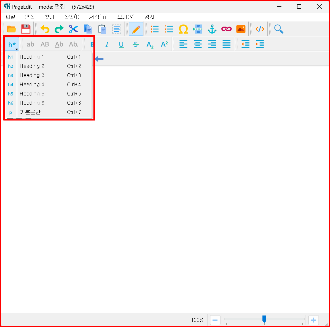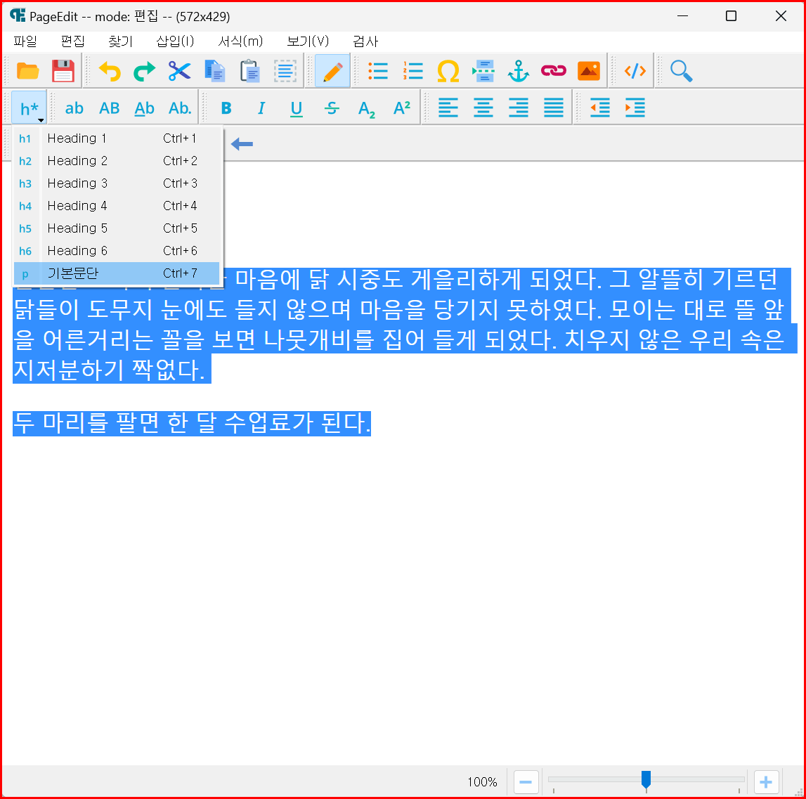 편집기에서 글자 크기를 적용하기 위해서는 먼저 문단 태그를 정하고 입력할 수도 있지만, 나중에 블록을 씌우고 문단 태그를 지정할 수도 있습니다.