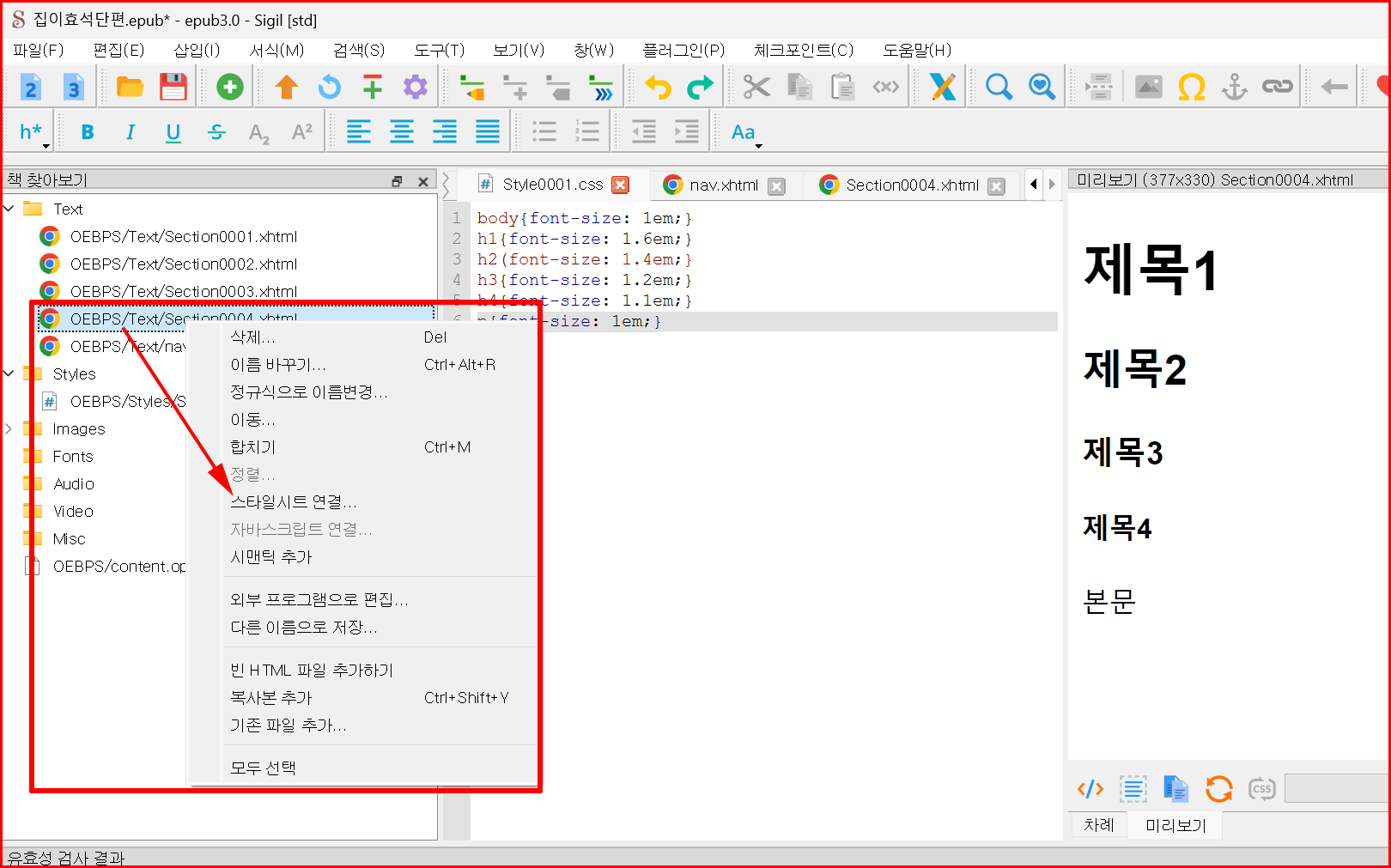 스타일시트를 연결하는 방법은 해당 html파일을 마우스 우클릭하여 떠오르는 팝업 메뉴에서 '스타일시트 연결'을 선택하면 적용됩니다. Sigil에서 중요한 기능은 '마우스 우클릭'에 있습니다.