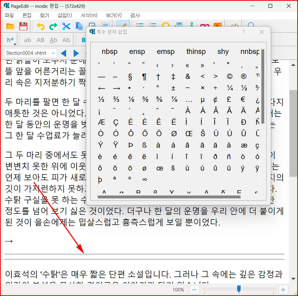 Sigil의 편집창과 스타일시트 관계를 살폈습니다. 또한 편집기인 'PageEdit'에서 글자 크기를 적용하는 방법을 공부했습니다. 특수문자를 입력하는 경우는 '특수문자' 창을 열어놓고 계속 작업을 해도 됩니다.