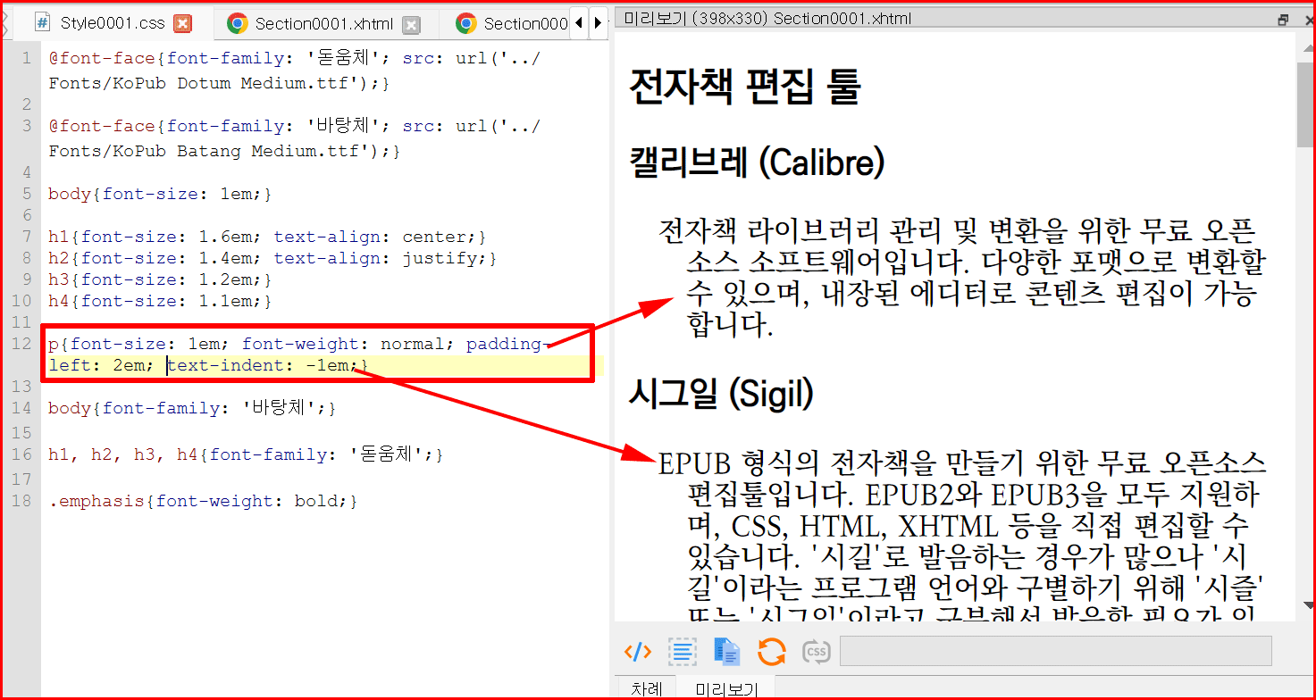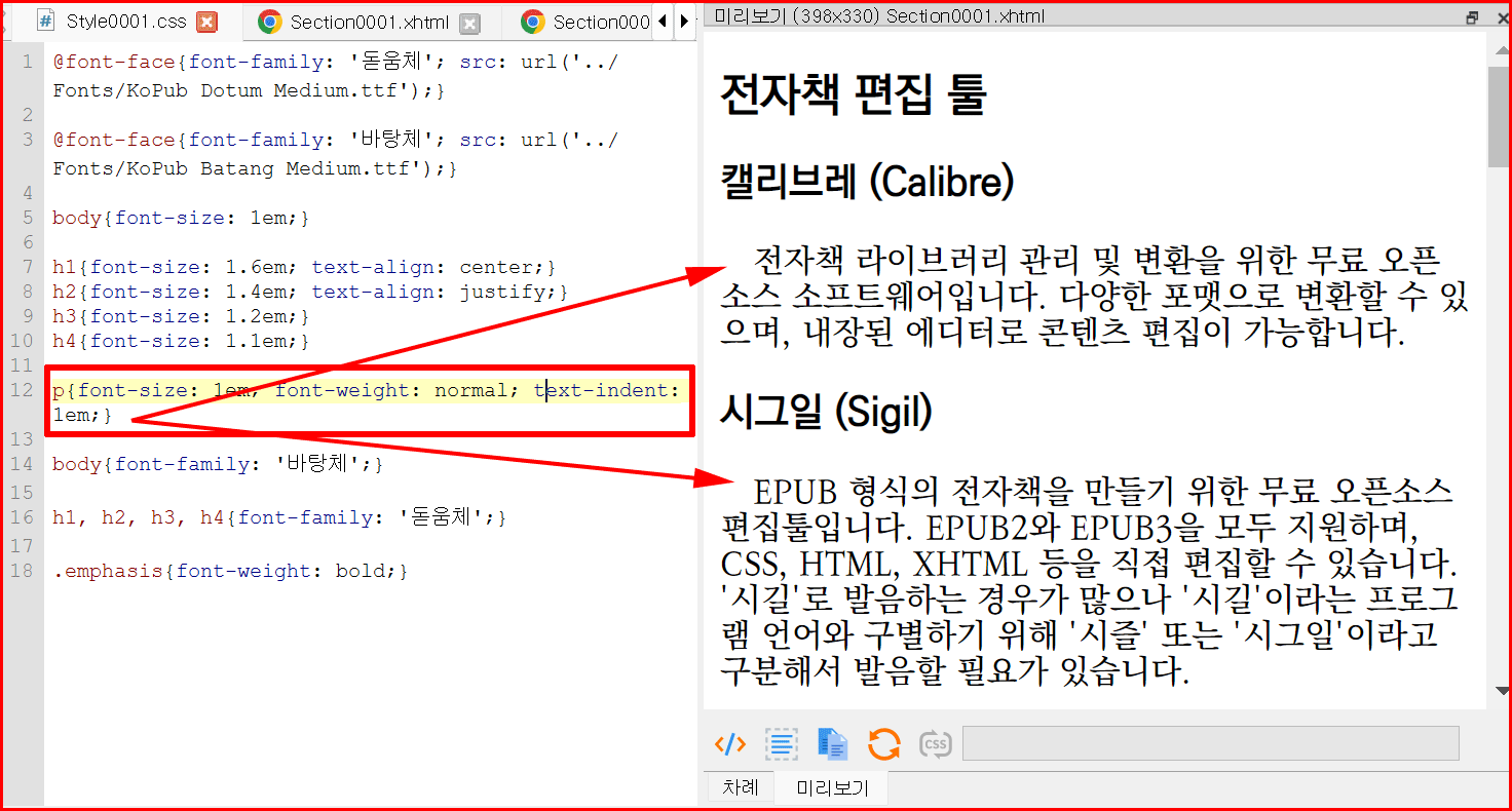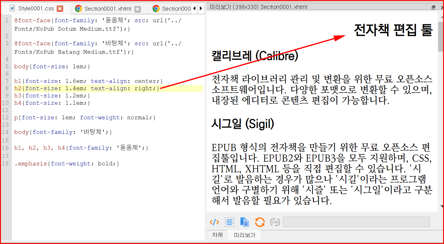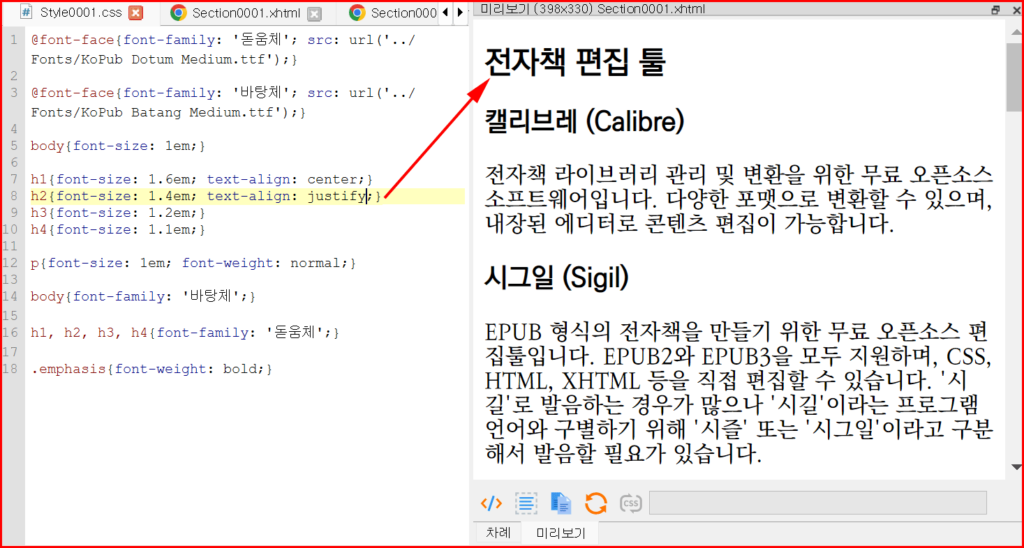 스타일시트에 문단 정렬 부분을 추가하면서 바로 전자책 문장이 달라지는 것을 눈으로 확인할 수 있습니다.