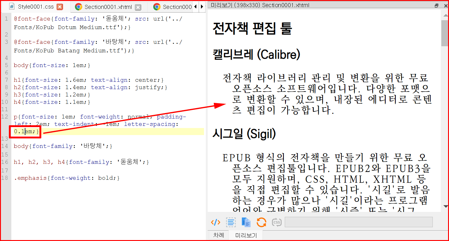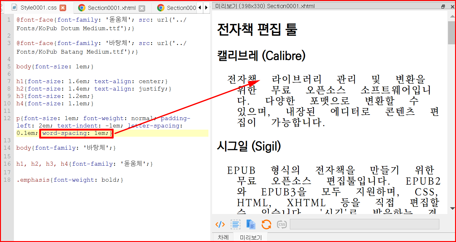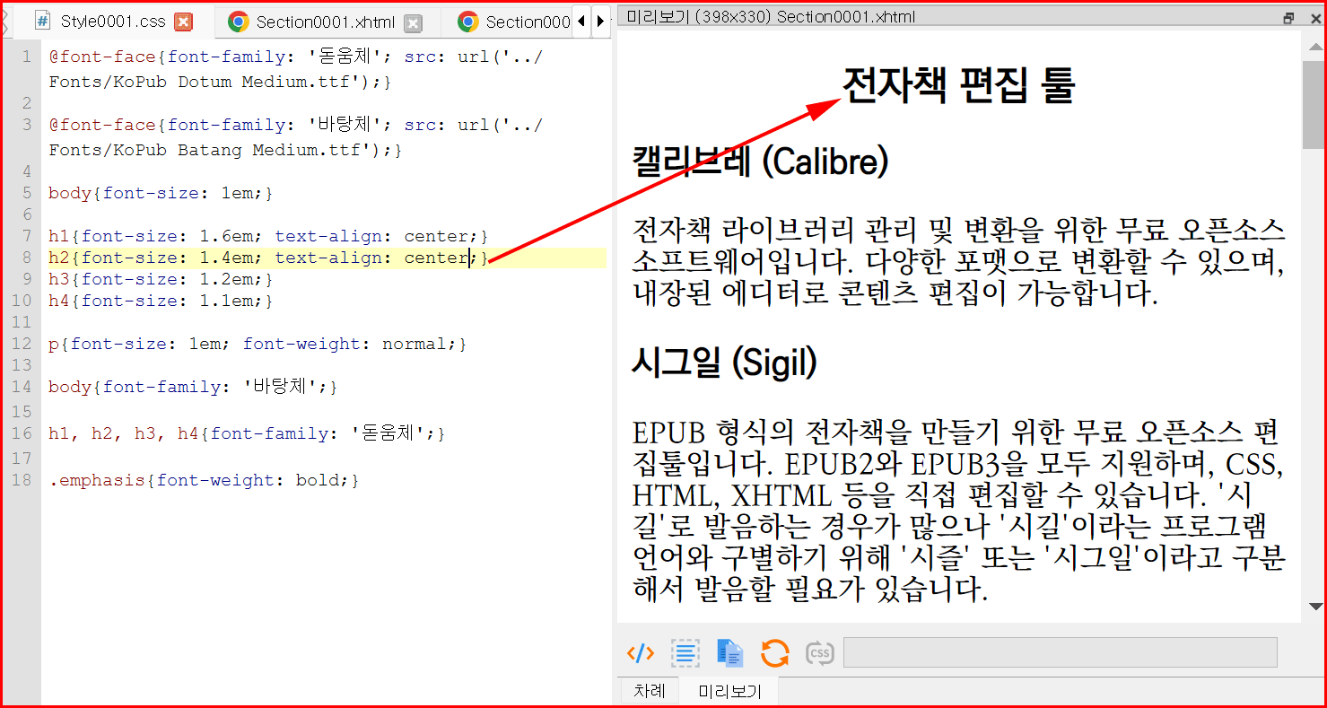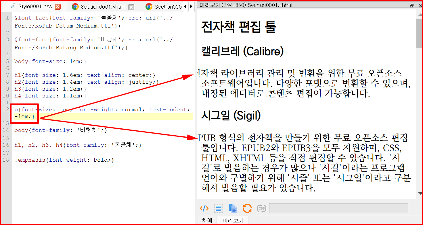 스타일시트에 문단 정렬 부분을 추가하면서 바로 전자책 문장이 달라지는 것을 눈으로 확인할 수 있습니다.