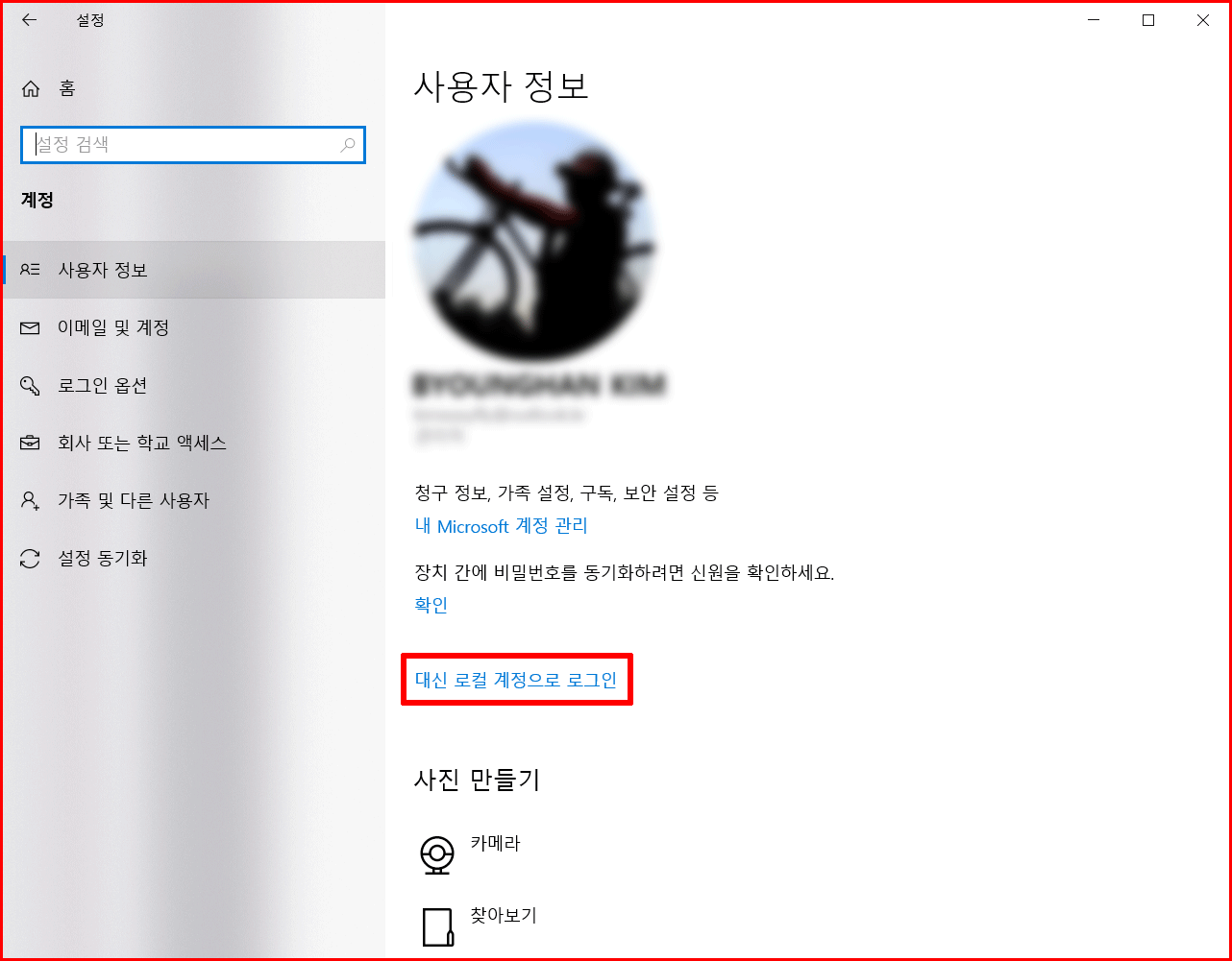 사용자 정보가 나옵니다. 자신의 마이크로소프트 계정과 프로필 아래에 '대신 로컬 계정으로 로그인' 항목이 있습니다. 이것을 선택하면 로컬 계정으로 전환이 가능합니다.