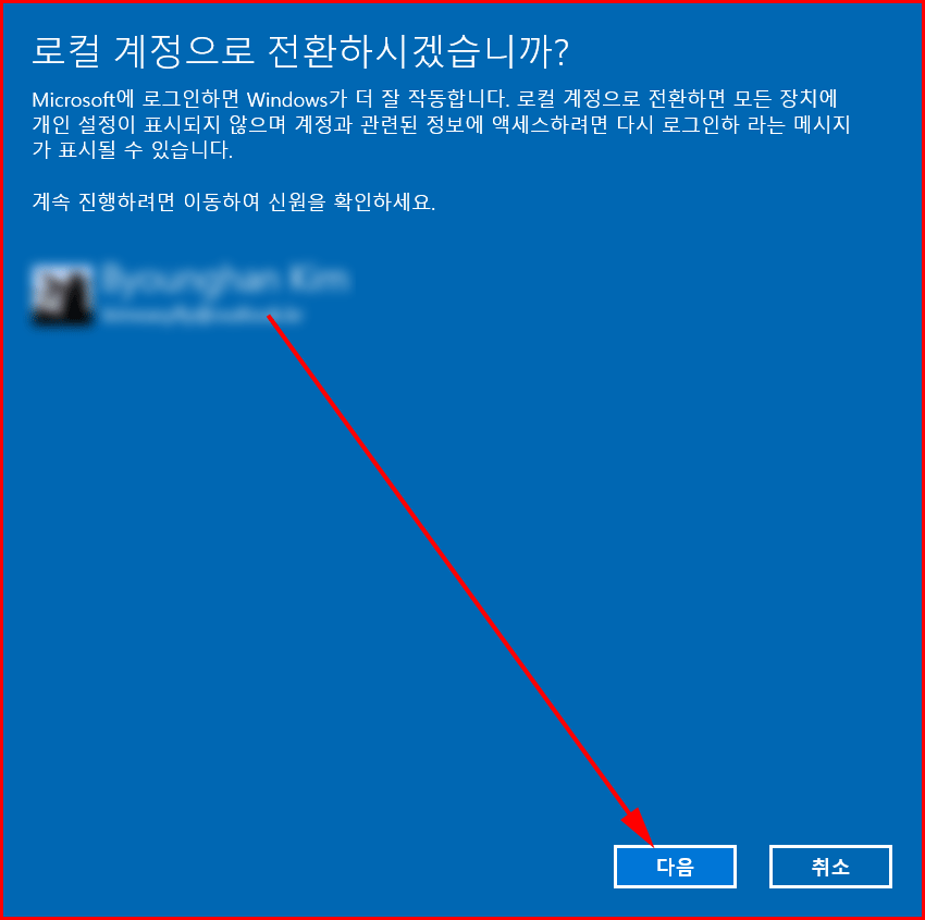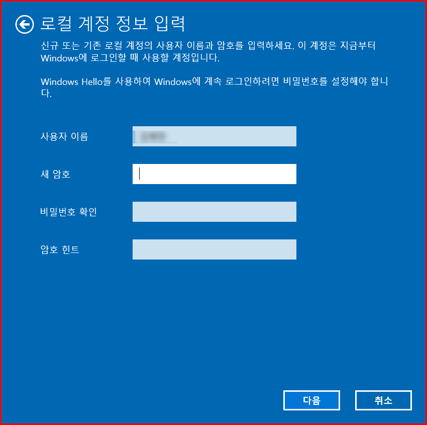 로컬 계정 정보 입력을 요구합니다. 자신의 이름을 등록하면 좋습니다. 그간에는 마이크로소프트 계정의 앞 몇글자를 사용자 이름으로 사용했다면 로컬 계정을 이용할 때는 자신의 본명을 제대로 입력하여 사용하는 것이 좋습니다.