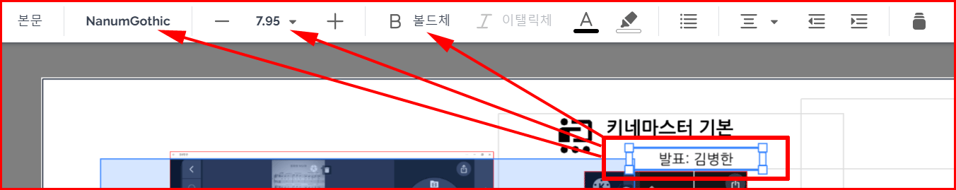 프레지에서 폰트를 추가하려면 작업 중인 화면에서 글자를 선택합니다. 글자가 선택되면 파란 네모로 글자가 쌓이면서 화면 상단에 편집 기능이 나타납니다.