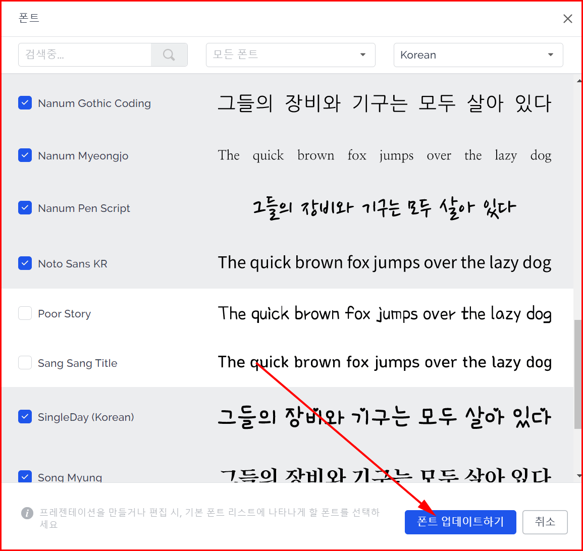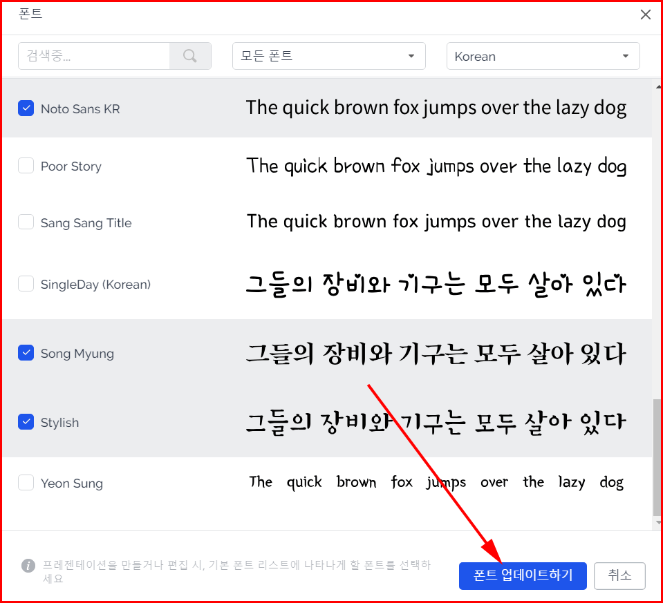 폰트 리스트 중에 설치하고자 하는 서체를 선택하고 '폰트 업데이트하기'를 클릭합니다. 효과적으로 선택하려면, 폰트를 업데이트하기 전에 필터링이 필요합니다.