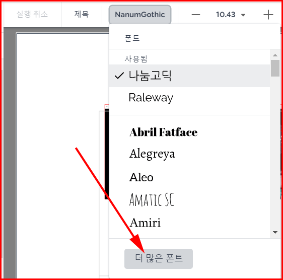여기서 선택한 글자의 폰트나 크기를 지정할 수 있는데 이 중에서 폰트를 클릭하면 심겨진 폰트 리스트와 '더 많은 폰트'가 나옵니다. 여기서는 선택된 'NanumGothic'을 클릭하면 아래로 관련된 폰트 정보가 나오네요.