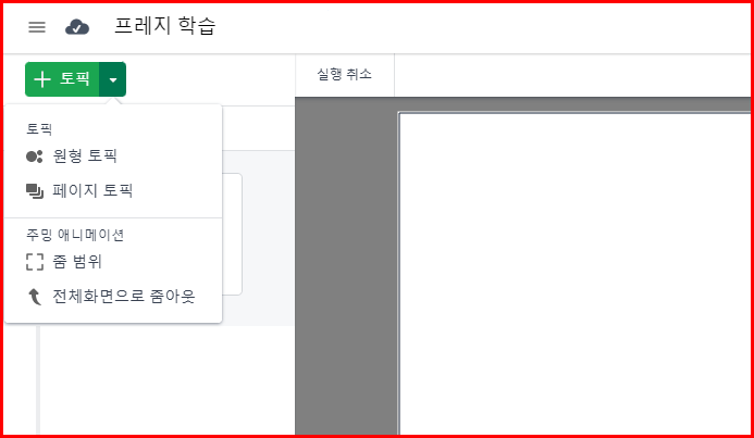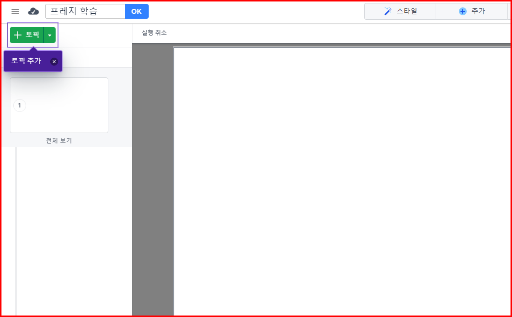 제목을 설정합니다. 나중에 설정해도 무방하지만 순서상 먼저 제목을 적겠습니다. 여기서는 '프레지 학습'이라고 정했습니다. 방법은 제목에 커서를 두고 제목을 적어주면 됩니다.
