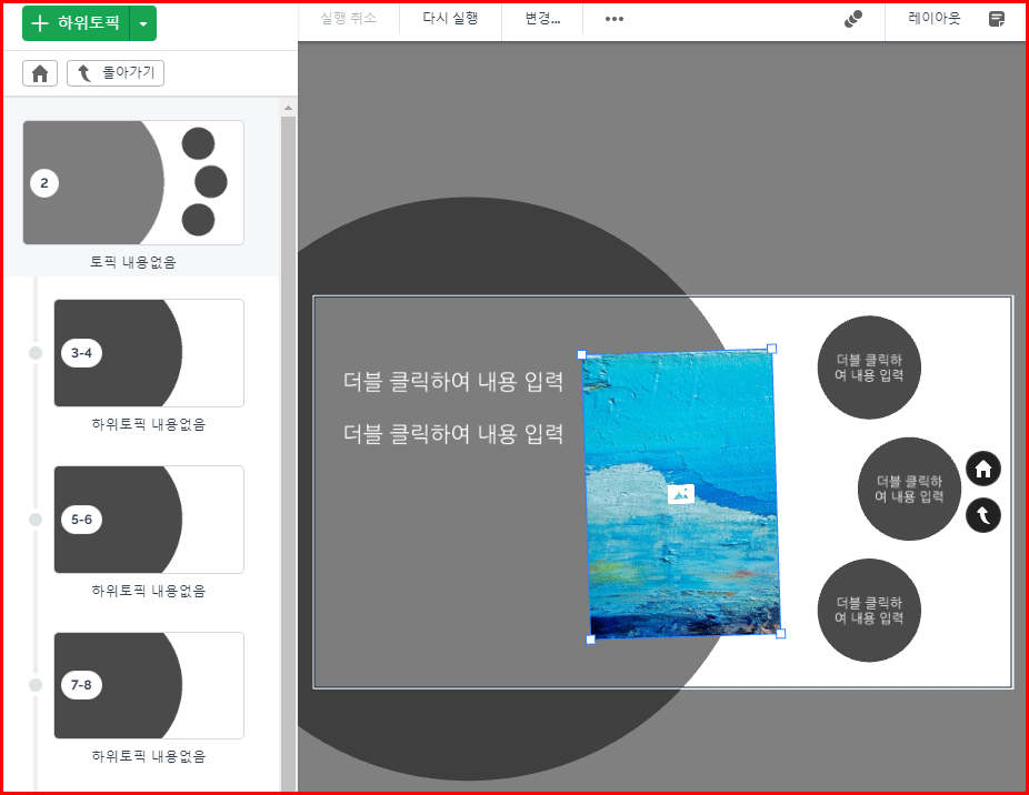 가운데 원형 토픽도 들어가면 아래와 같은 템플릿 기능이 포함되어 있습니다. 만들려는 의도에 맞지 않으면 지우는 게 상책입니다.