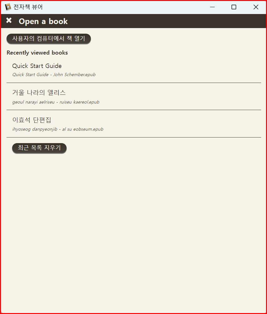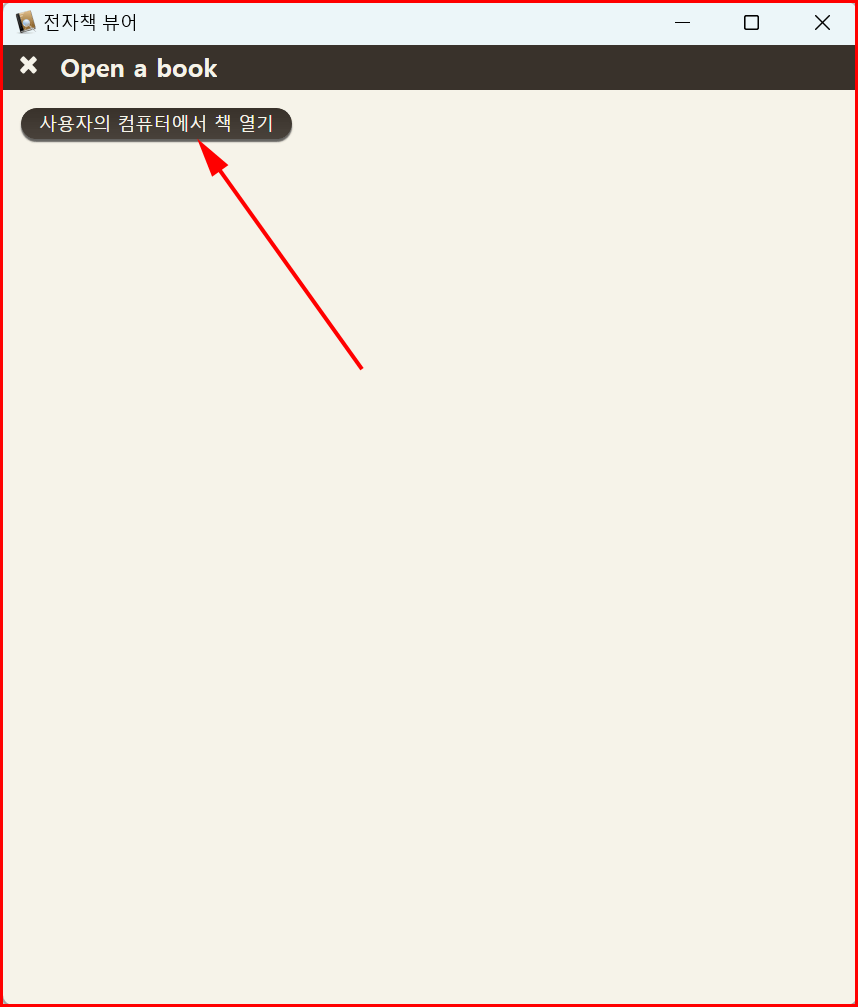 상단 '사용자의 컴퓨터에서 책 열기'를 선택합니다. 전자책이 있는 폴더에서 책을 선택하면 바로 열립니다. 파일이 어디에 있던 상관없습니다.