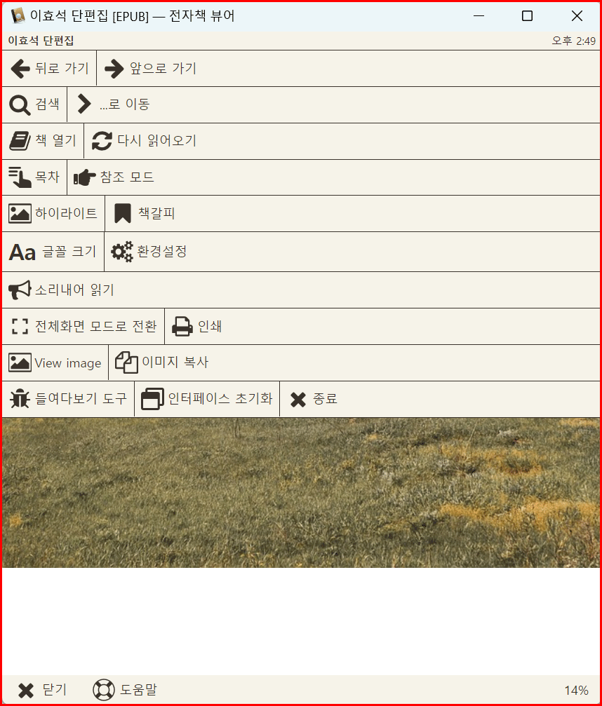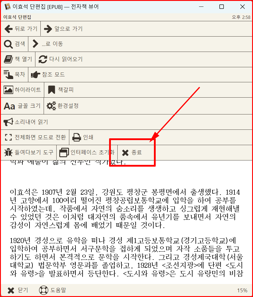 전자책을 종료할 때는 창을 꺼서 끝낼 수도 있고, 메뉴가 나온 상태에서 '종료'를 선택해서 끝낼 수도 있습니다. 메뉴만 닫을 때는 하단 아래의 '닫기'를 클릭하면 메뉴만 닫아집니다. 또는 ESC, 마우스 우클릭으로 메뉴는 자취를 감춥니다. 마우스 우클릭은 전자책을 이용하는 '토글 키'인 셈입니다.