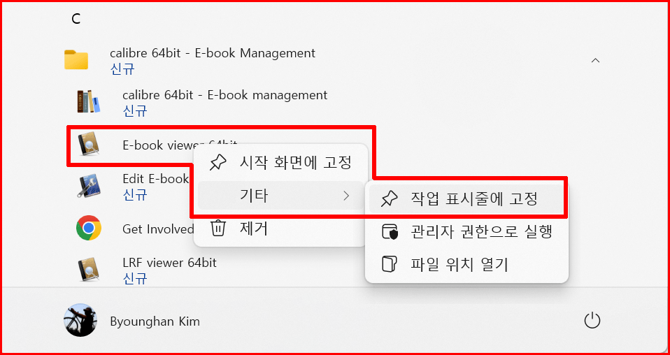 전자책 뷰어를 '모든 프로그램'을 열어 시작하기 귀찮으면 '작업 표시줄'에 등록해서 사용하면 편합니다. 시작 버튼과 모든 프로그램을 열고 전자책 뷰어를 선택한 상태에서 마우스 우클릭으로 '작업 표시줄에 고정'을 클릭하면 다음부터는 작업 표시줄에 등록된 아이콘으로 쉽게 실행할 수 있습니다.