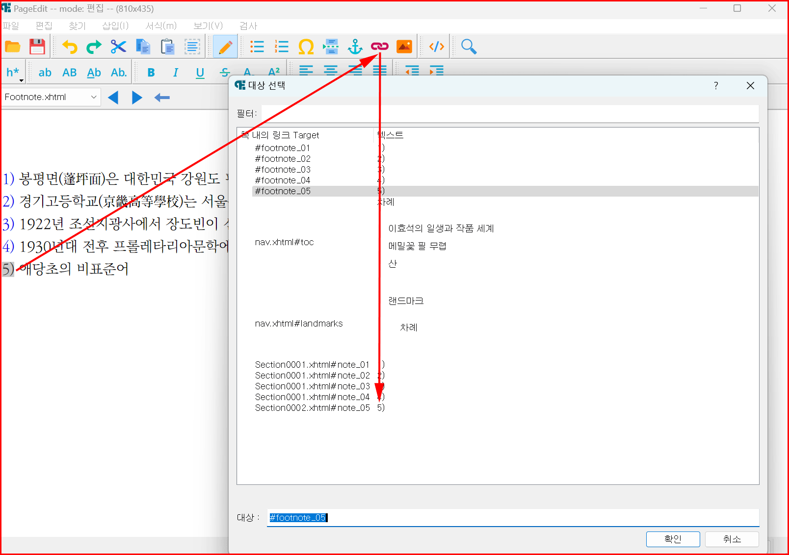 마찬가지로 주석에서도 앞 주석 숫자를 블록으로 선택하고 하이퍼링크 처리합니다. 타깃은 본문의 'Section0002.xhtml#note_05'로 연결됩니다.
