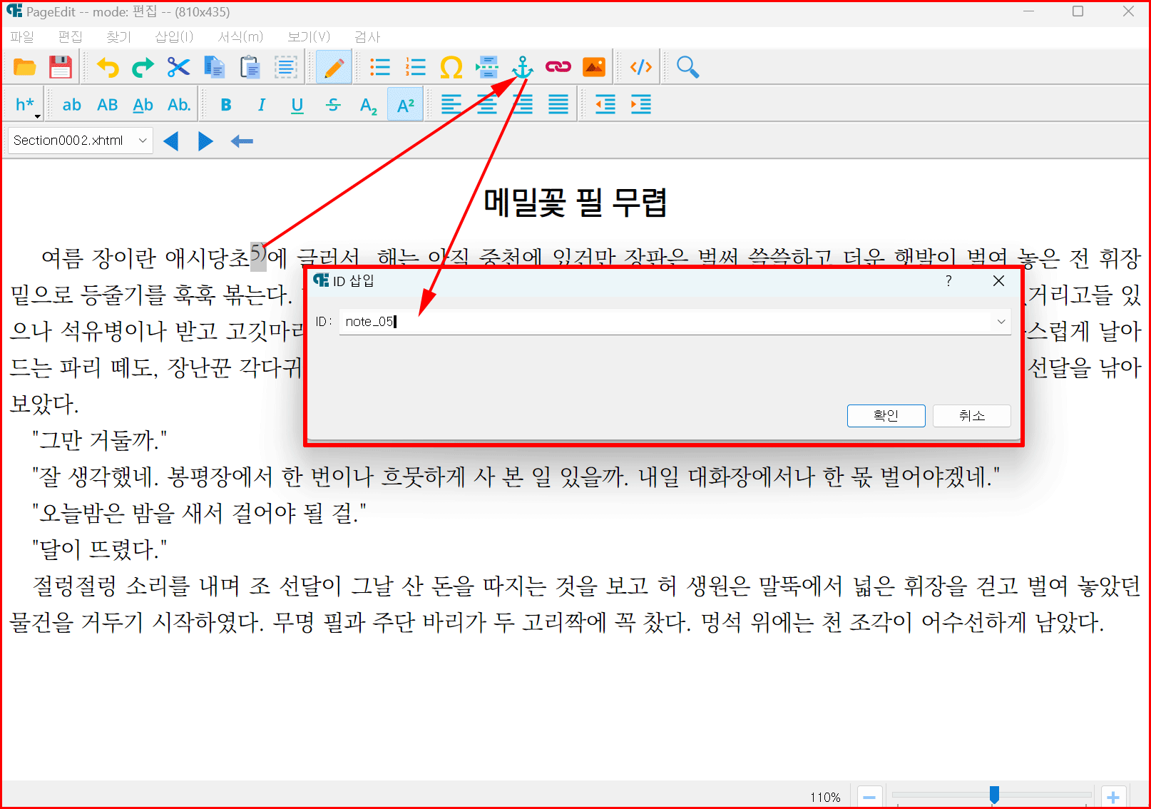 '애시당초'의 의미를 주석 처리하려는 경우 먼저 주석 페이지(Footnote.xhtml)에 해당 주석 ID를 등록해야 합니다. 등록하는 요령은 '닻' 표시의 아이콘을 선택해서 팝업창이 나오면 ID를 등록합니다. 여기서는 'footnote_05'로 했습니다. 서로 교신이 이루어지는 셈입니다. 본문 'note_05'와 주석 페이지의 'footnote_05'가.