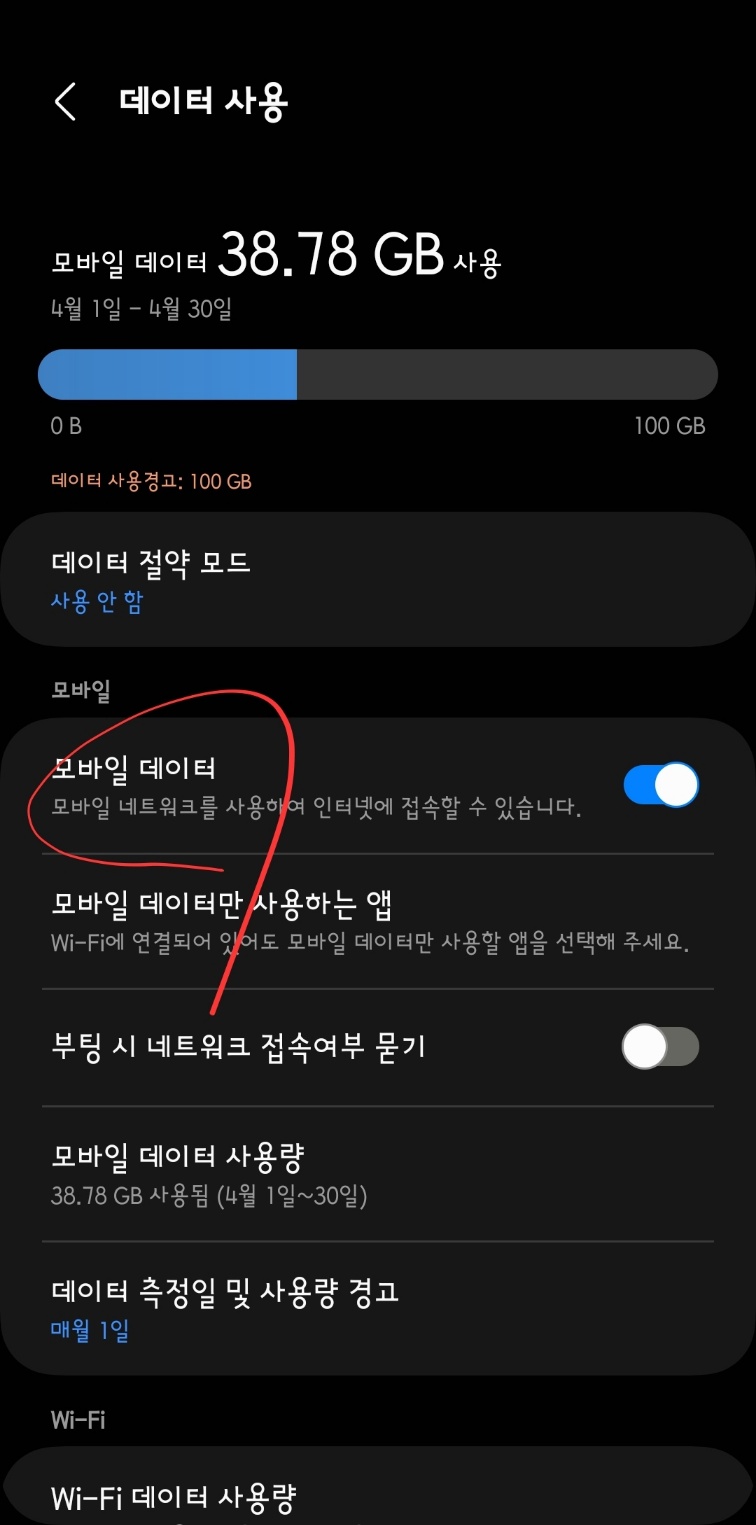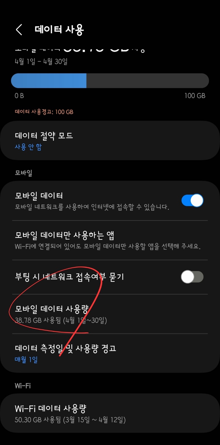 '데이터 사용'을 더 들어가 보겠습니다. 현재까지 사용한 데이터가 실시간 반영되고 있습니다. 제가 사용한 데이터가 오늘 12일 0시 기준으로 38.78GB 사용하고 있다는 표식입니다. 제 경우 한 달 사용 한도 100GB 요금제를 사용하기에 '데이터 사용 경고'는 100GB로 설정했습니다.