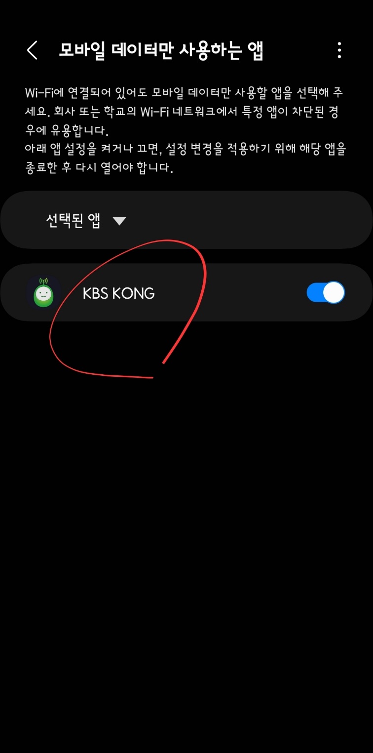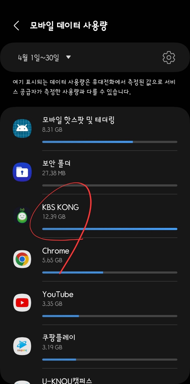 'KBS KONG'이 가장 모바일 데이터를 사용하는 것을 확인할 수 있네요. 와이파이를 사용하게 되면 와이파이존이 바뀌면서 FM 방송 수신에 장애가 생겨 저의 경우 '모바일 데이터만 사용'하고 있습니다.