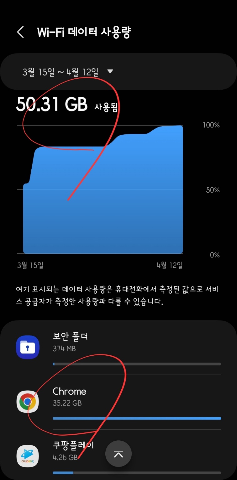 와이파이는 계산 기간이 한 달입니다. 위 사례는 3월 15일부터 오늘까지네요. 한 달 사용량이 50.31GB입니다. 많이 사용된 어플은 '크롬'이구요. '쿠팡플레이'도 만만치 않네요. 영화 데이터가 용량이 크다 보니 스트리밍 데이터가 많은 용량을 썼군요.