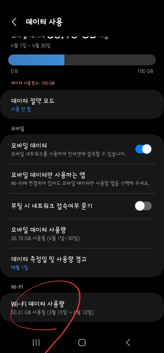 물론 와이파이 데이터 사용량에 대한 정보도 있습니다. 제일 하단에 'WiFi 데이터 사용량'이란 꼭지가 그것입니다.