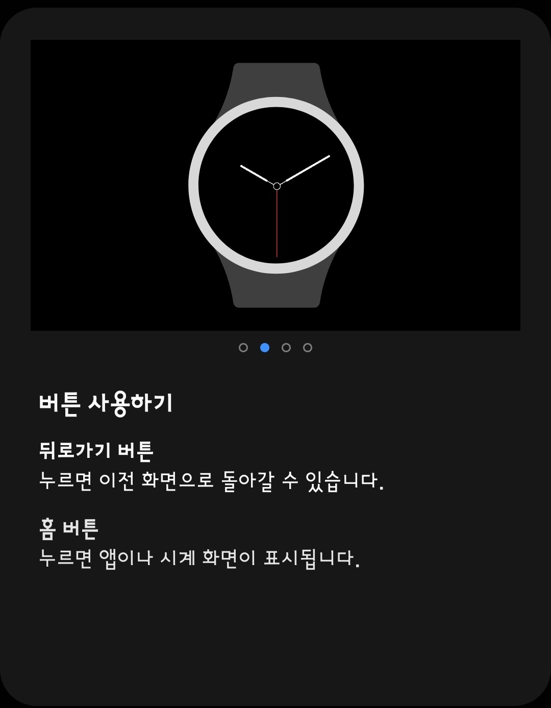 스마트폰 내비게이션 바와 같이 워치에도 두 개의 중요 버튼이 있습니다. 위 버튼이 '뒤로 가기' 버튼입니다. 폰의 '뒤로 가기'와 같습니다.