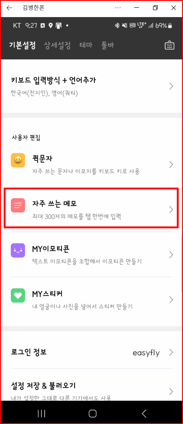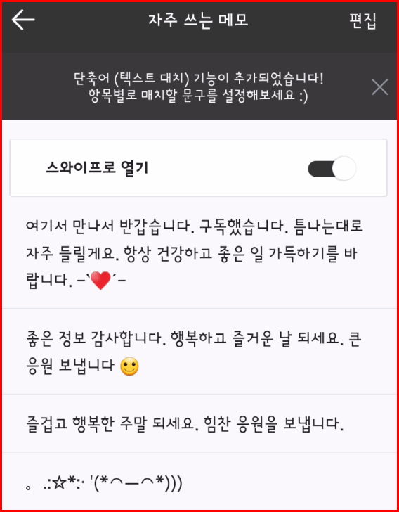 자주 사용하는 메모는 위 '퀵문자'보다 규모가 큽니다. 여기에 '자주 쓰는 메모'로 등록하여 사용하면 한 번의 선택으로 많게는 '300자'까지 한꺼번에 입력할 수 있습니다.