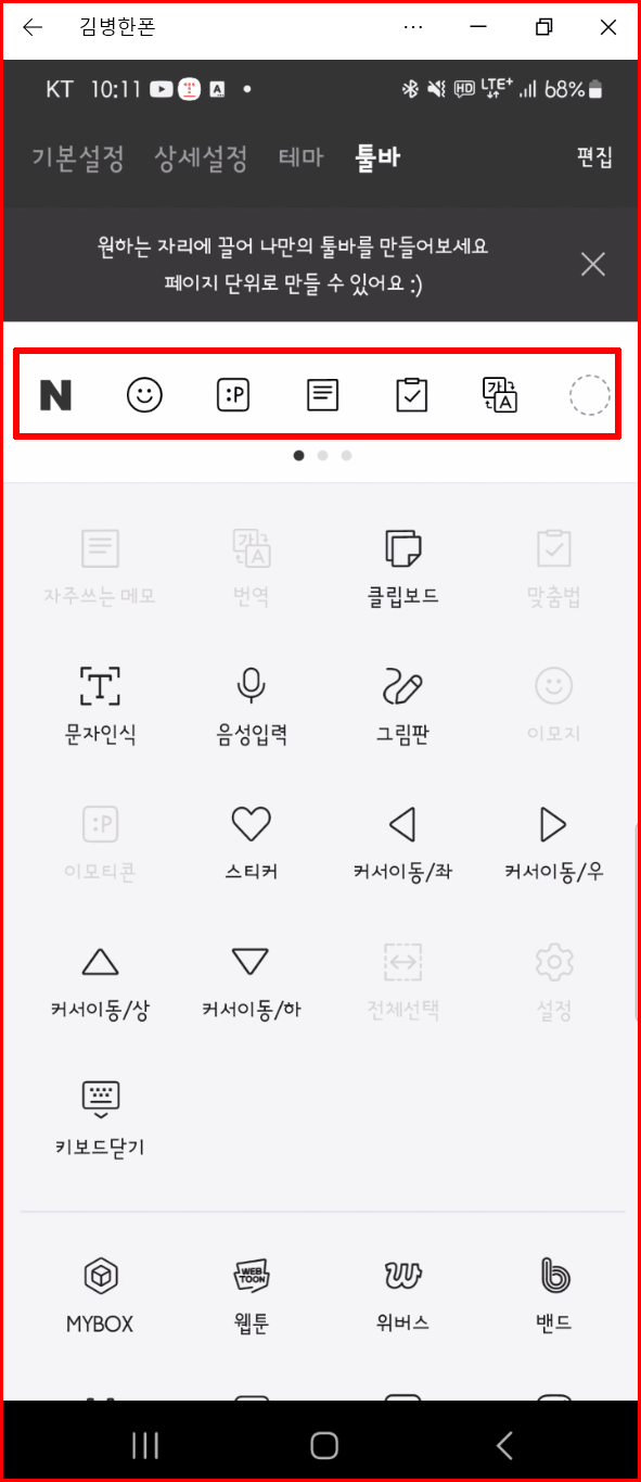 툴바도 자신의 취향에 맞춰 사용할 수 있습니다. 여기서 '툴바'란 네이버 스마트보드 위에 있는 아이콘이 모여 있는 패널을 의미합니다. 이곳에 자신이 자주 사용하는 도구를 올려놓고 사용할 수 있습니다.