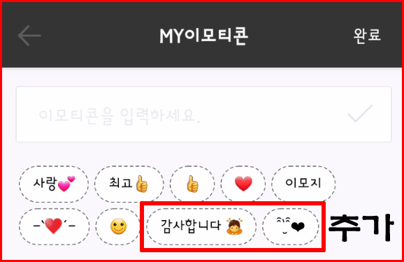 이모티콘이 모여 있는 것을 알 수 있습니다. 새 이모티콘을 등록하려면 '편집' 환경에서 등록하고 '완료'하면 됩니다. 물론 삭제도 가능합니다.