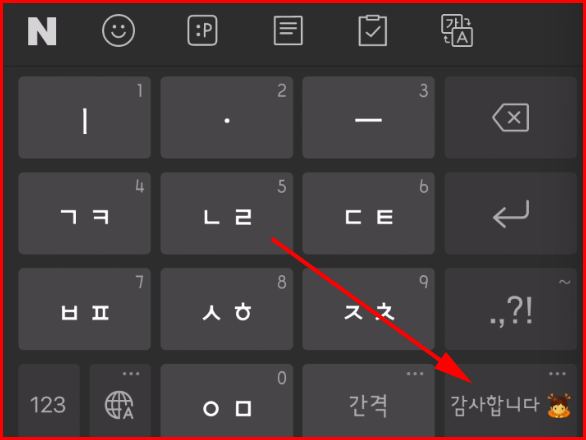 키보드 우하단의 키는 여러 키를 사용할 수 있는 특수키로 현재는 '감사합니다.'가 등록되어 있습니다. 이 상태에서 저 키를 누르면 아래와 같이 누를 때마다 '감사합니다.'가 입력됩니다.