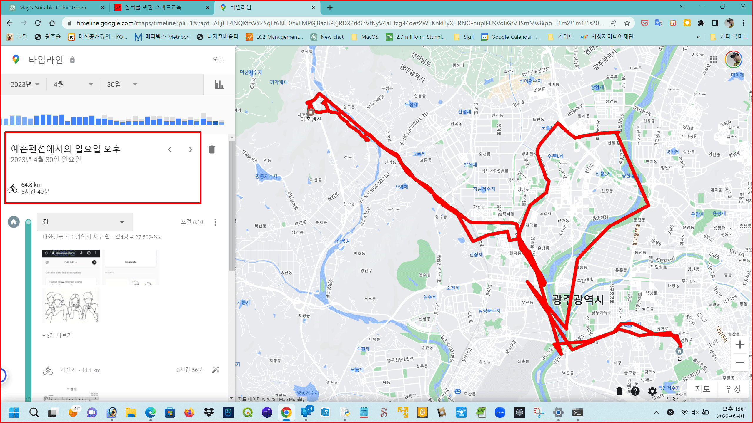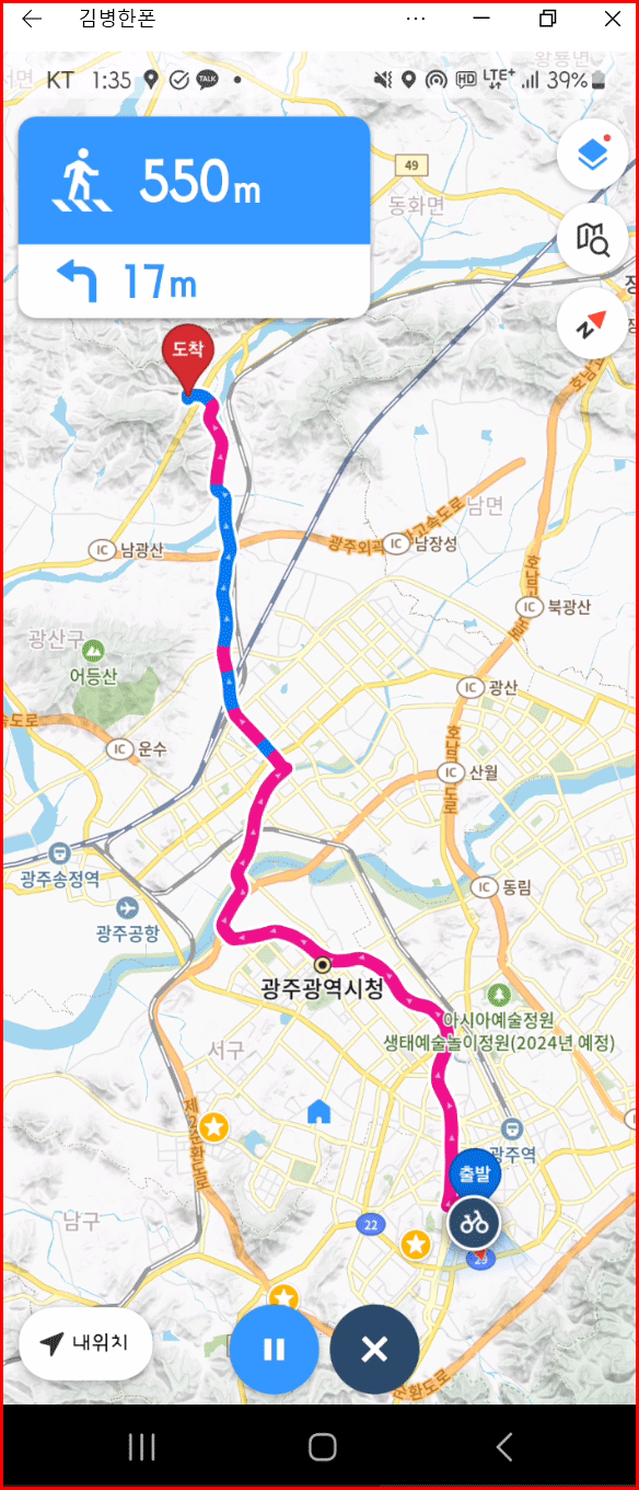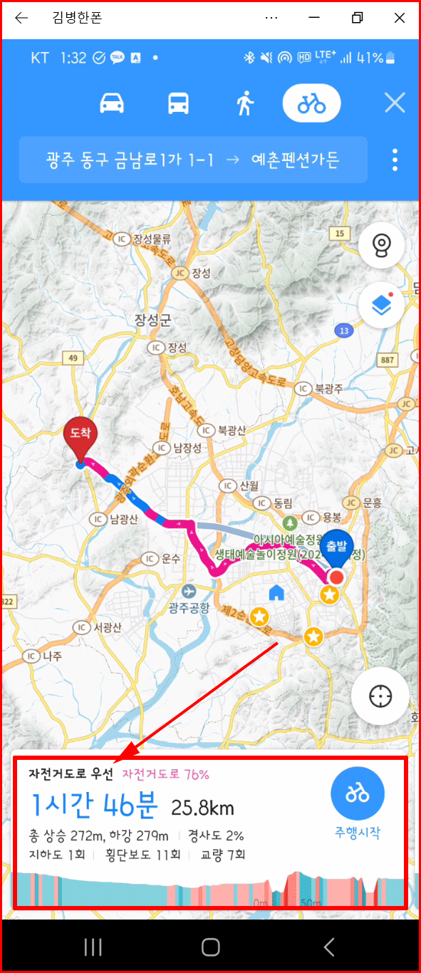 그러다 보니, 이리저리 얽히고 설켜 내가 가는 길은 뒤죽박죽이 됐습니다. 자전거와 차의 기본적인 차이가 반영되지 않은 내비의 잘못인지, 내 인지 능력의 잘못인지? 탓하고 싶지는 않습니다. 결국 1시간이면 갈 수 있는 거리를 2시간이 걸려 도착했습니다.