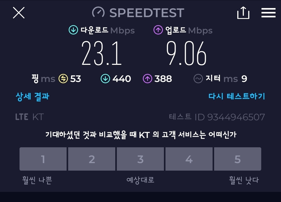 4. 결과 확인: 테스트가 완료되면 다운로드 속도, 업로드 속도, 그리고 핑(ping) 시간을 확인할 수 있습니다.