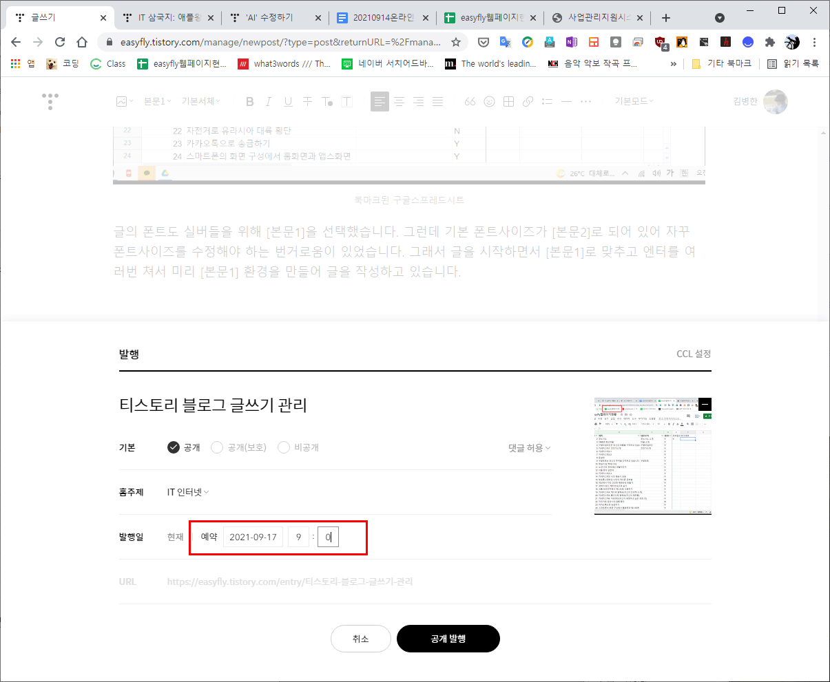 저는 평일에는 시간이 별로 없어서 토요일과 일요일을 이용하여 블로그 글을 작성합니다. 작성된 글은 한꺼번에 올리지 않고 예약해서 매일 정해진 시간에 올리고 있습니다. 제가 정한 시간은 아침 8시로 정했습니다. 8시가 출근 시간이기 때문에 저도 블로거로서 출근한다는 의미로 8시 정각에 글을 올리도록 예약했습니다. 미진한 글도 예약 날짜를 맞춰 놓고 그 안에 수정하거나 보충하면 되거든요.