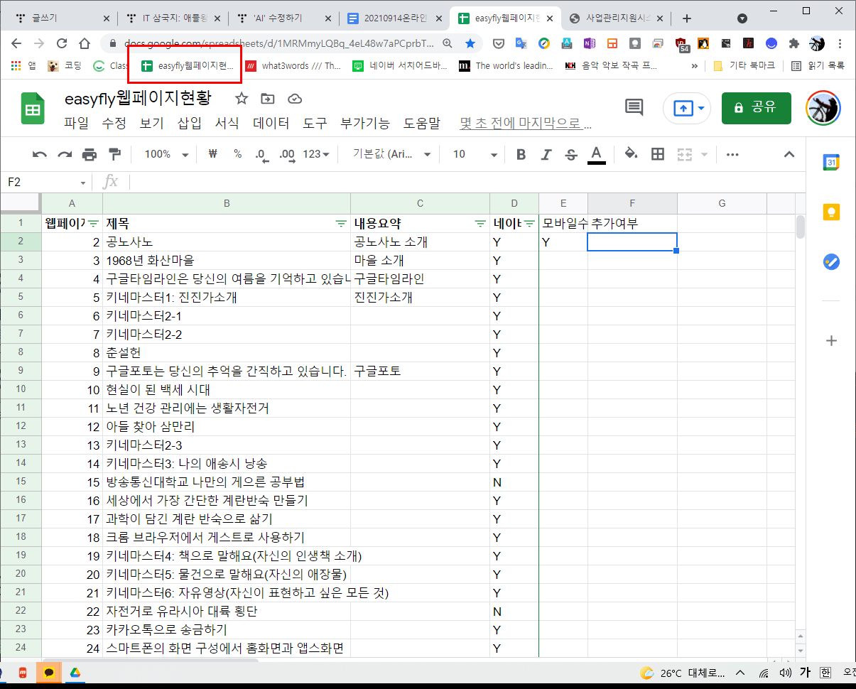 또한 글의 목록을 구글스프레드시트를 통해 관리합니다. 글목록이 정리되어 있어 링크를 건다든가 네이버웹마스터에 수집 요청을 할 때 중복을 막을 수 있어 편했습니다. 구글스프레드시트는 북마크를 걸어 바로 들어갈 수 있도록 했습니다.