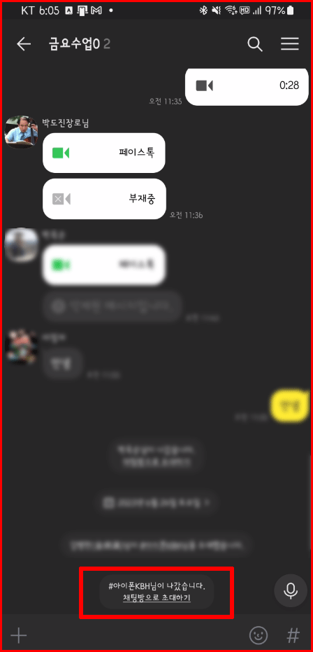 단체 카톡방에서 나가는 것은 그 모임에서 빠지겠다는 뜻입니다. 단톡방 '금요수업'에서 나가기를 시도하겠습니다.