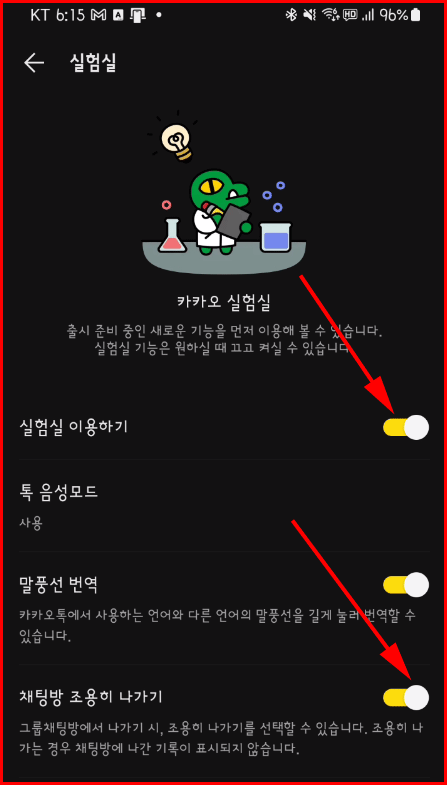 실험실은 출시 준비 중인 새로운 기능을 먼저 이용할 수 있는 기회를 주는 곳입니다. 이곳에서 '실험실 이용하기'와 '채팅방 조용히 나가기'를 모두 선택해야 합니다.