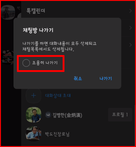 '조용히 나가기'를 선택한 후 '나가기' 버튼을 클릭하면 '아무개님 나갔습니다'라는 메시지가 남지 않습니다. 설정하는 방법은 이전 포스트에서 소개했습니다.