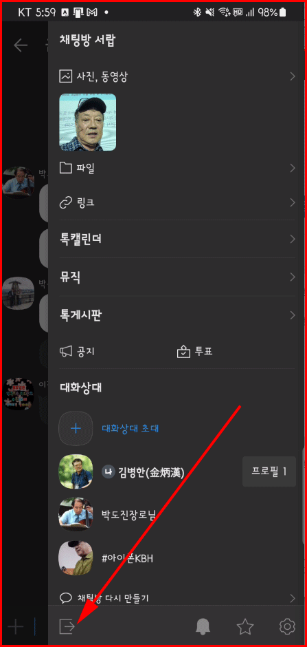 선택하면 여러 가지 기능들이 있는데 좌하단에 나가기 아이콘이 있습니다. 이것을 선택하면 단톡방에서 빠져나오면서 모든 기록과 방 자체가 없어집니다.