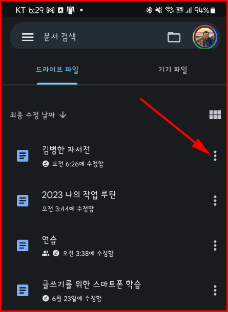 '편집'과 '보기'를 번갈아 가면서 사용하다가 '관리'가 필요하면 뒤로가기 버튼으로 '리스트'가 나오도록 하면 됩니다. 각 리스트에는 '삼 점 더보기'가 있습니다. 각 파일에 대한 추가 작업을 시도하는 도구입니다.