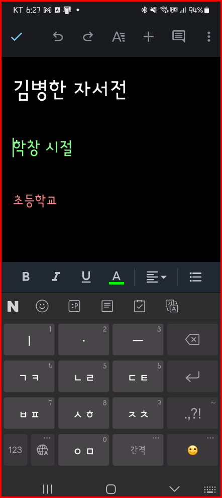 스마트폰에서 구글 문서로 자서전을 작성합니다. 시니어 모임에서 노트북을 가지고 다니기 어렵기 때문에, 소지하고 다니는 스마트폰으로 토의하면서 기록을 합니다. 구글 문서는 클라우드 서비스라서 따로 '저장'의 개념은 없습니다. '작성하고 마치고'라고 생각하면 좋겠어요. 좌상단 '체크'를 탭 하면 '보기' 모드가 되면서 '편집'을 마칩니다. 다시 작성하려면 우하단의 '연필'을 탭 하면 됩니다.