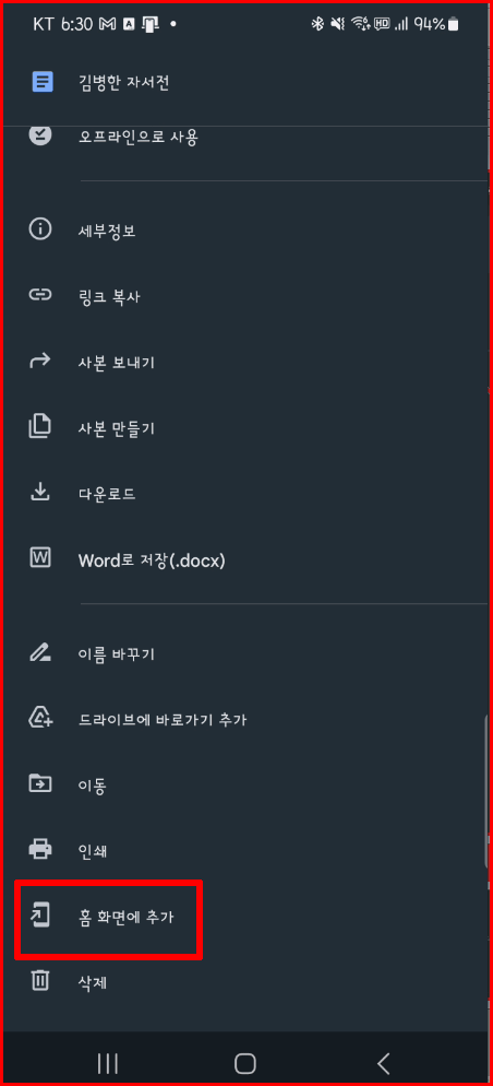 위 자서전 파일을 홈화면에 추가하면 사용이 편합니다. 여러 차례 과정을 한 번으로 줄이는 것입니다. '삼 점 더보기' 메뉴에는 여러 기능 중 '홈화면에 추가'가 있습니다. 메뉴 리스트 아래쪽에 배치되어 있습니다.