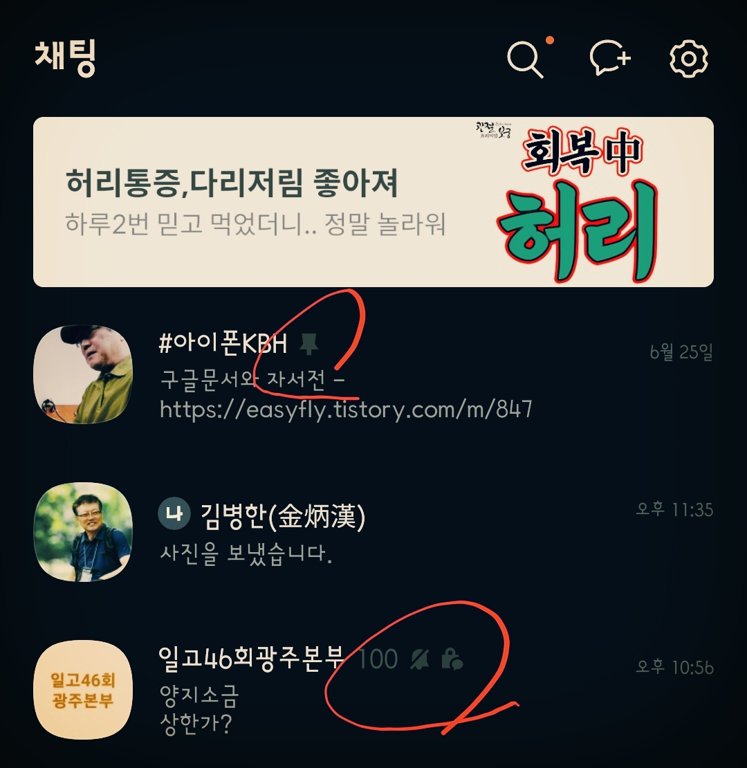 제 경우는 동창회 단톡방을 '채팅방 입력 잠금'을, 아이폰 친구방을 '채팅방 상단 핀 설정'으로 적용했습니다. 잠근 이유는 민폐를 끼친 적이 있었거든요. 상단 고정은 아이폰에서 자료를 수시로 받거든요.