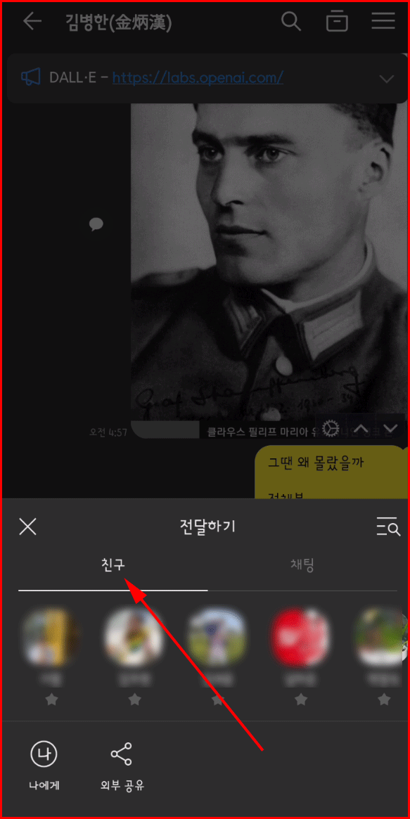 전달할 친구 1명을 선택합니다.(먼저 선택하는 것이 중요)