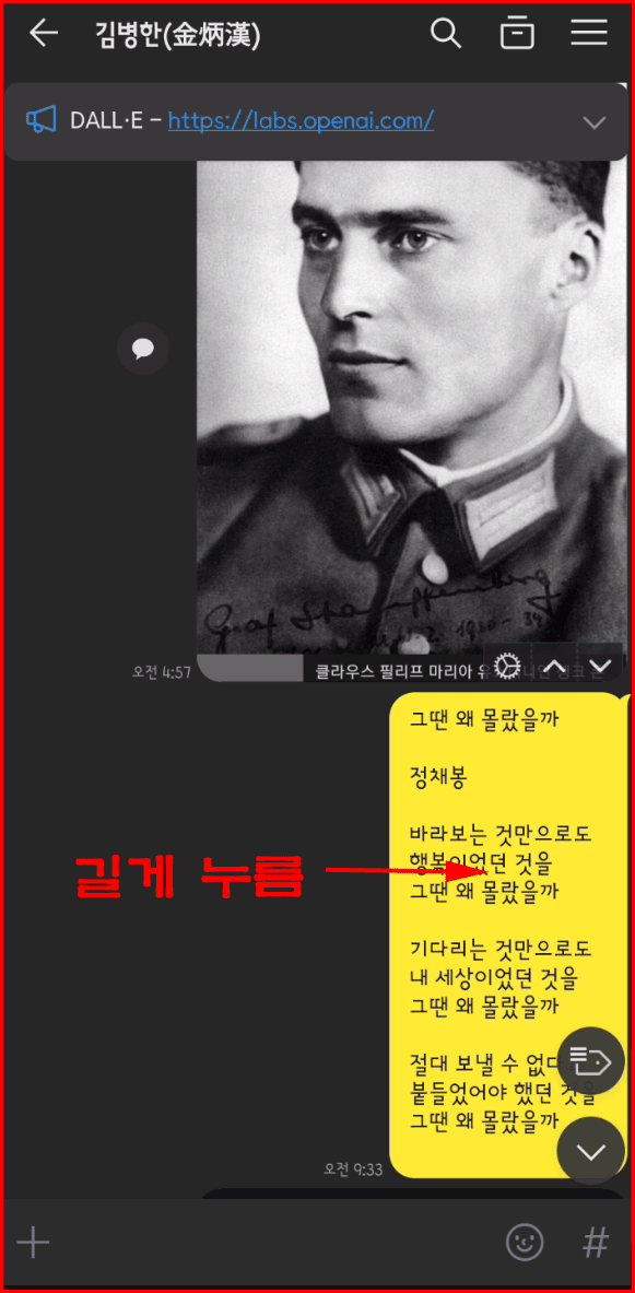 먼저 자신에게 원본 메시지(다른 친구에게 보낼 메시지)를 남깁니다. 정채봉 시인의 '그땐 왜 몰랐을까?'를 길게 누릅니다. 길게 누른다는 것은 1초 이상을 누른다는 말입니다.