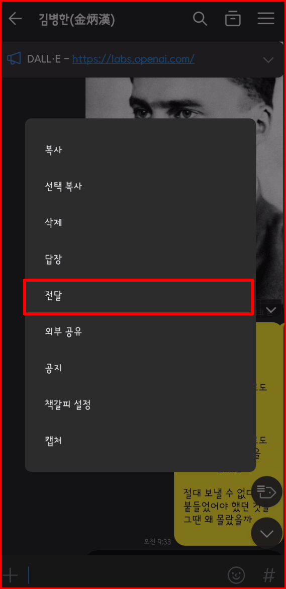 여러 옵션 중에서 '전달’을 누릅니다.