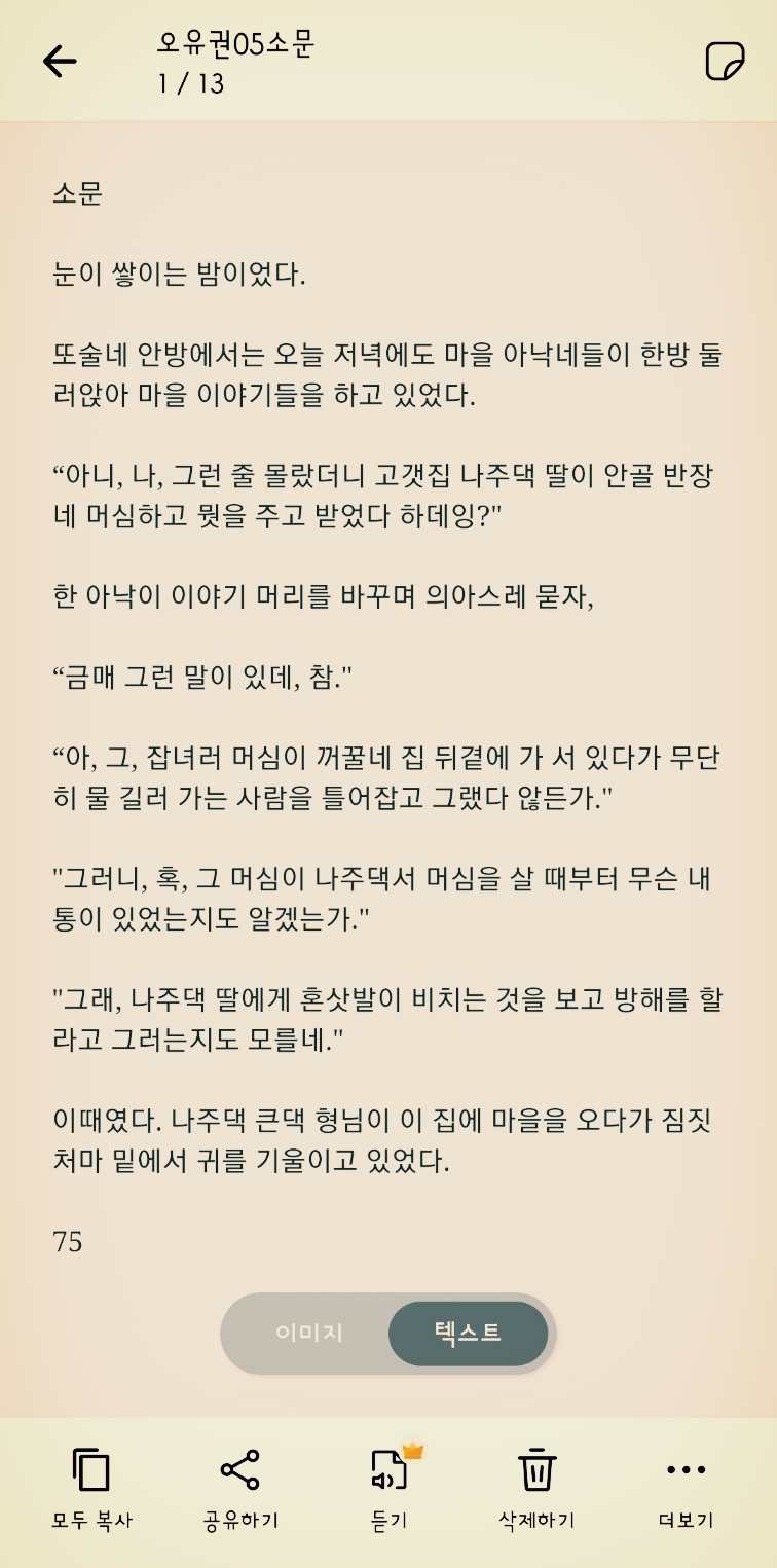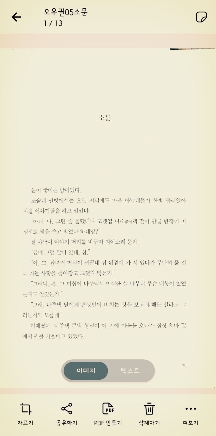 오유권 단편 소설 '소문'을 스캔했습니다. 13페이지 정도의 짧은 단편이네요. 이미지로 스캔된 것을 '텍스트 인식하기' 과정을 거치면 텍스트로 기억하게 됩니다. 그러나 파일이 만들어진 것은 아닙니다.
