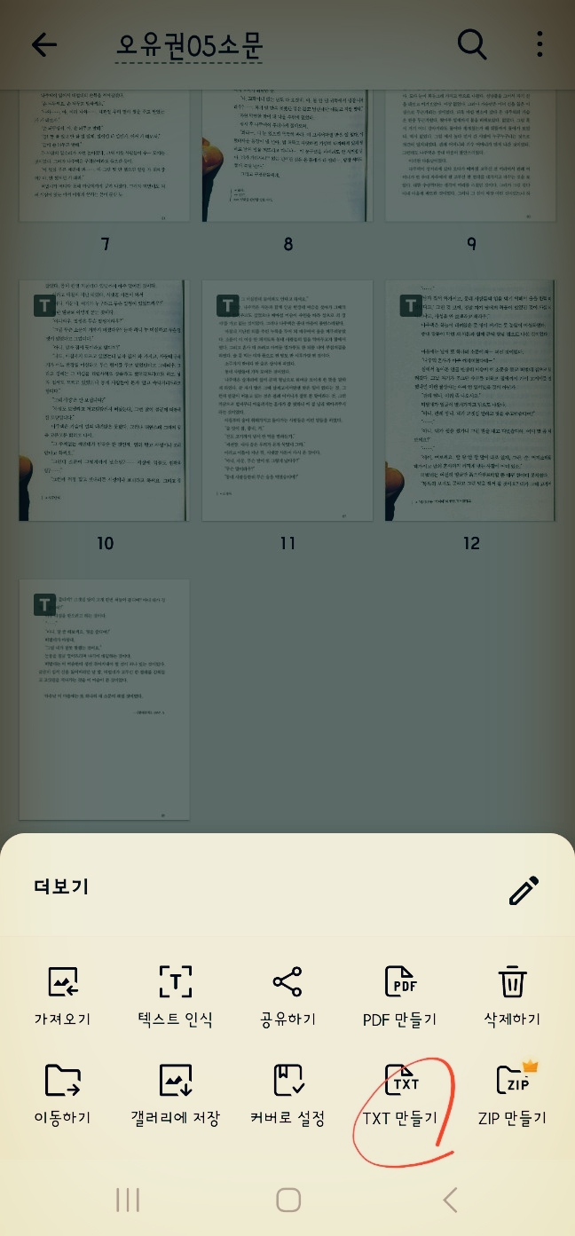 일단 텍스트 파일로 저장합니다. 방법은 우하단 '삼 점 더보기'를 선택하여, 'TXT 만들기'를 탭 합니다.