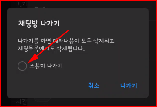 이 경우는 채팅방을 정말 나갈 것인지를 확인하는 경고 창이 올라옵니다. 이때 '조용히 나가기'를 선택하고 나가면 '아무개 님 나가셨습니다.' 메시지가 남겨지지 않고 조용하게 나갈 수 있습니다.