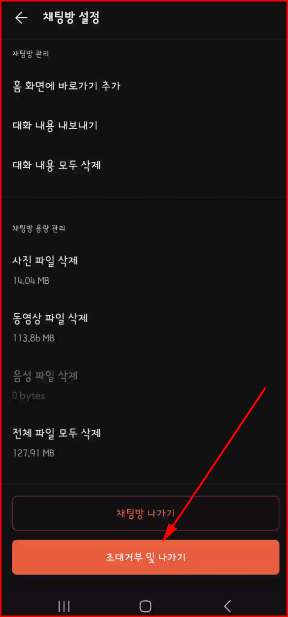 이 아이콘에서는 단톡방의 여러 환경을 세세하게 설정할 수 있는 버튼입니다. 이 가운데 마지막 '초대거부 및 나가기'를 선택하면 이 단톡방에서는 다시 초대할 수 없는 멤버가 됩니다. 다시 생각할 여지를 두지 않고 확실하게 선을 긋는 '나가기'가 되겠습니다.