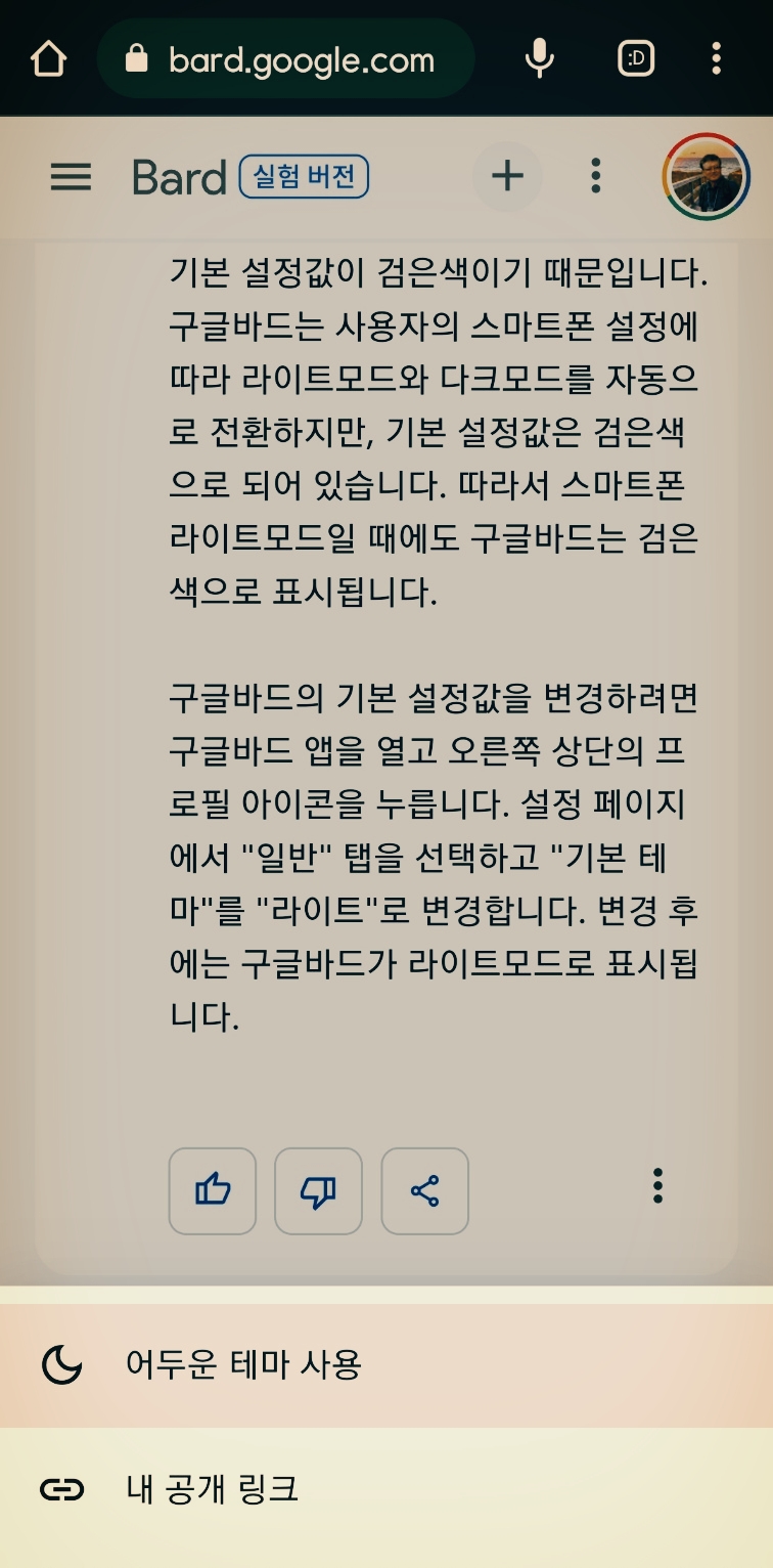 구글 바드를 사용하는데 배경색이 어둡다 하셨습니다. 시스템 설정에서 '라이트' 모드인데도.