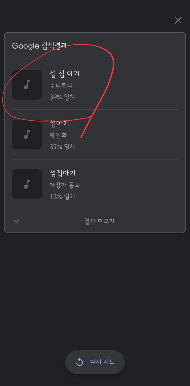 구글의 '음성 검색'과 '노래 검색'은 직관적으로 구별되네요. '음성 검색'은 말하기를 요구하는 짤로, '노래 검색'은 '파형' 짤로 보여줍니다. 노래를 부르면 비슷한 음색의 노래까지 확률로 알려줍니다. 어떤 가수의 노래와 몇 퍼센트 정도 일치한다고.